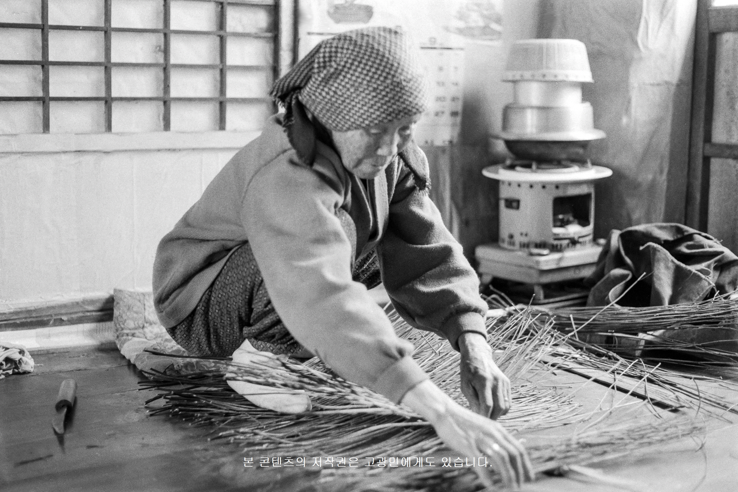 *개요 : ‘푸는체’ 바닥 재료인 두 개의 ‘살’이 하나의 조를 이루고 좌우 번갈아가며 ‘징ᄂᆞᆯ’에 끼워나가고 있다. ‘살’이 서로 포개지지 않게 굵기가 일정한 것들끼리 상하로 굵고 가는 것을 서로 맞붙여가며 차차 굵은 것부터 끼워나간다.