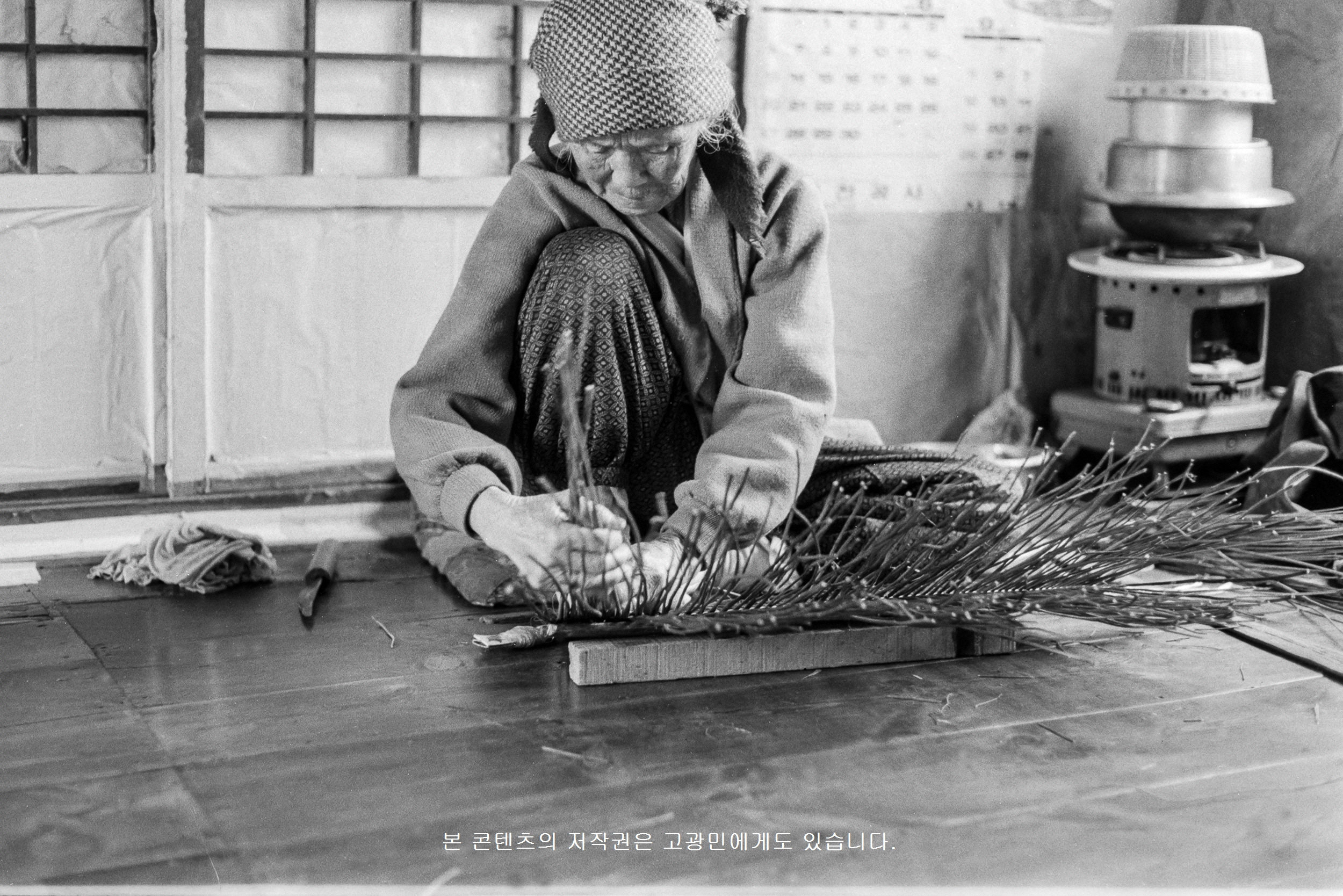 *개요 : ‘징ᄂᆞᆯ’에 ‘살’을 끼워놓고 나서 ‘징ᄂᆞᆯ’로 결어나가고 있다. 이를 ‘징 꾀기’라고 한다. ‘징 꾀기’를 위해서는 ‘징대’를 몸의 방향과 나란히 놓고 징을 꾀어나가야 한다. ‘징대’는 ‘푸는체’ 바닥을 짜는데 쓰이는 나무 자[尺] 모양의 연장이다. 양쪽 끝 가운데가 볼록하게 튀어나왔다.