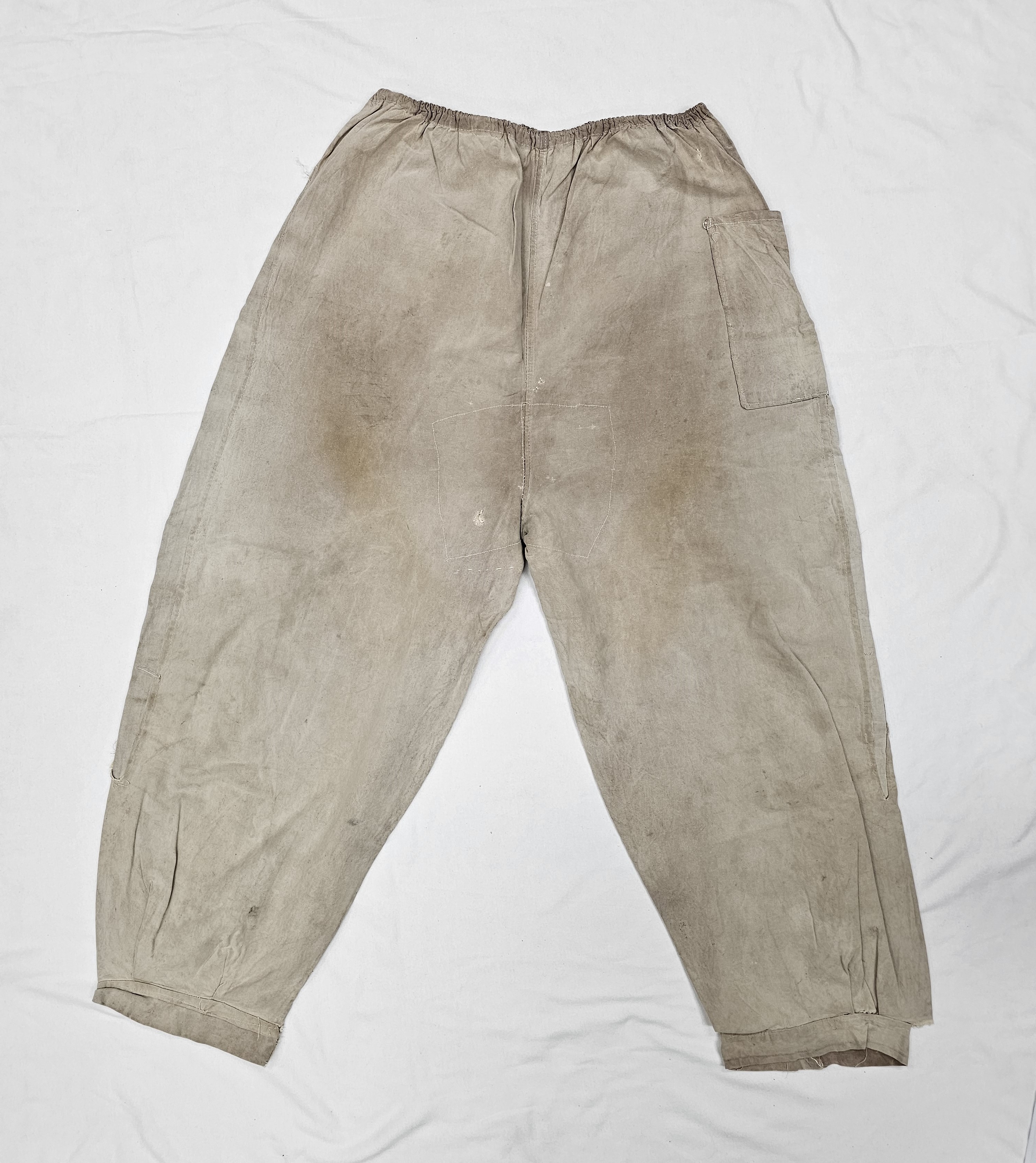 4) 설명: 감물을 들여 만든 하의임. 소재는 광목임. 허리에는 고무줄이 놓여 있고, 바짓부리로 갈수록 통이 좁아짐. 바지 왼편에는 주머니가 있음.