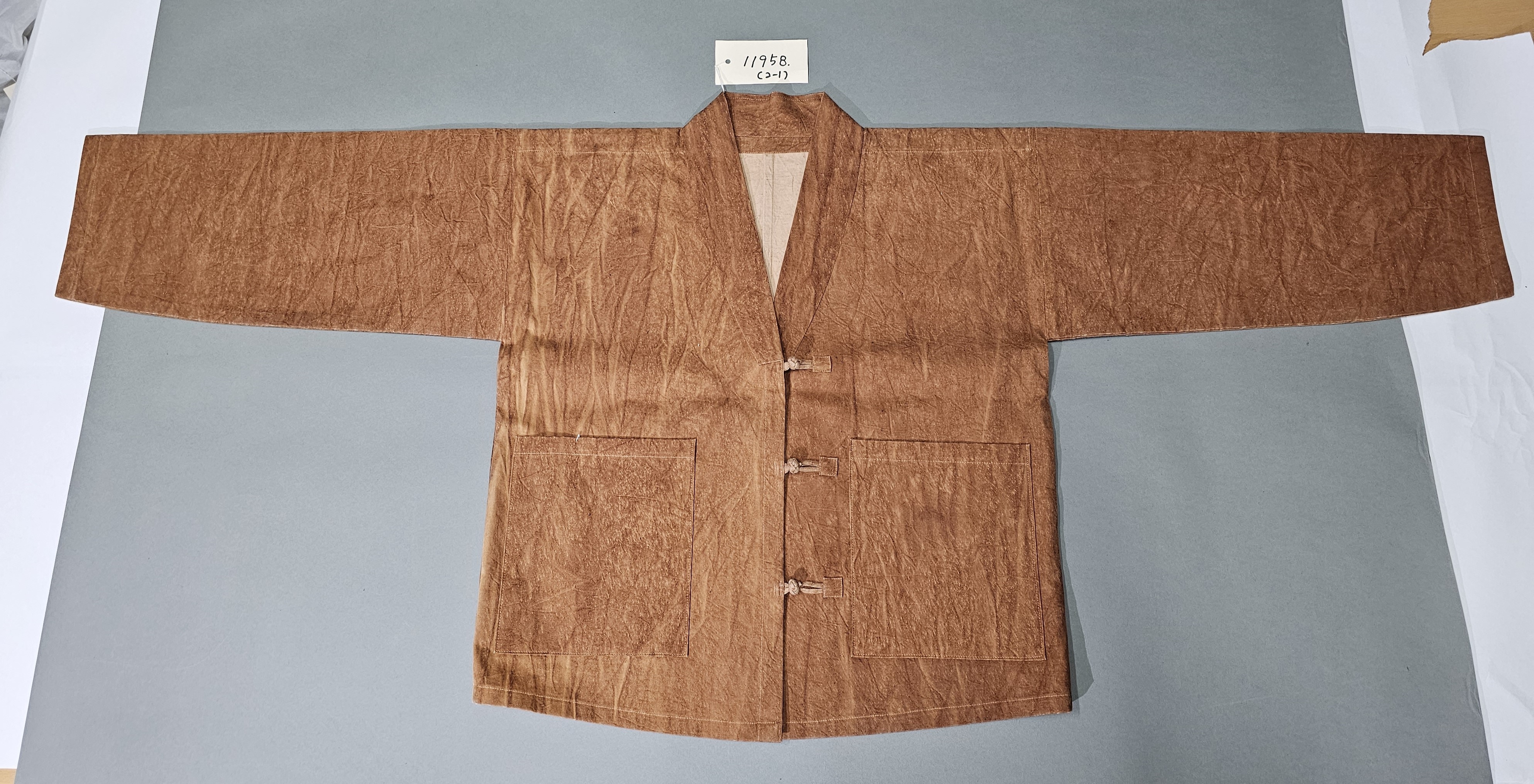 4) 설명: 감물 들인 남성용 갈적삼임. 옷감은 면이며 겉깃에 매듭단추가 달렸음.