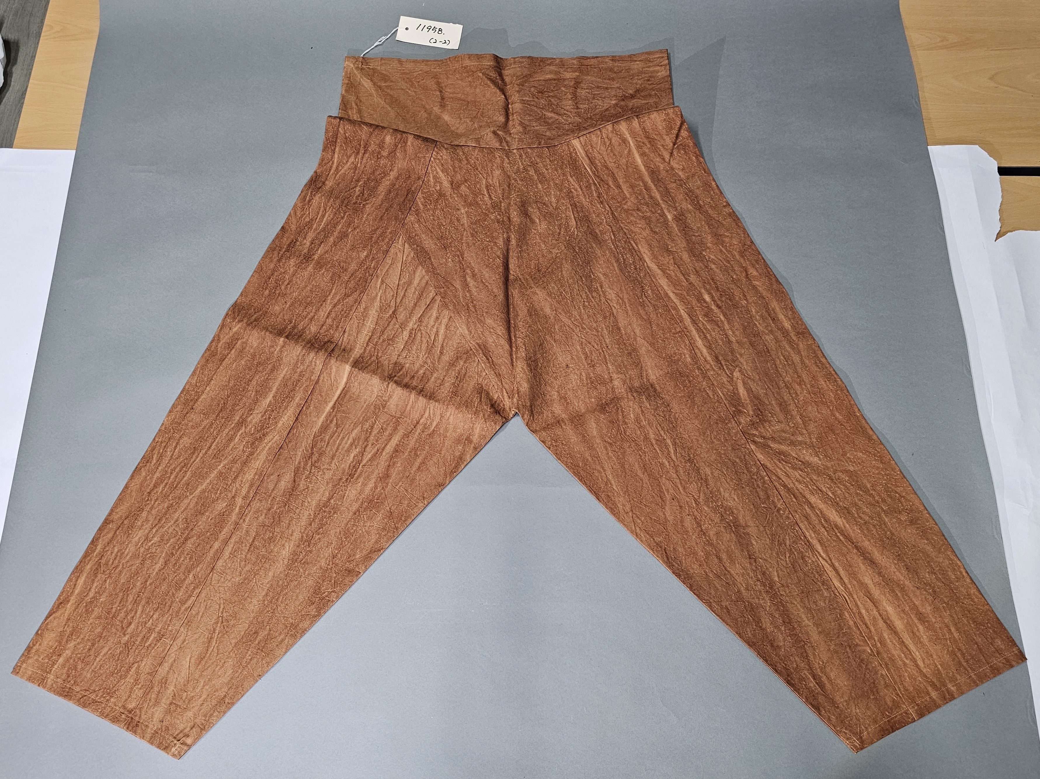 4) 설명: 감물 들인 남성용 하의임. 평상복으로 착용하였음. 허리에는 말기가 있고, 바지는 큰사폭과 작은사폭을 붙여 만들었음.