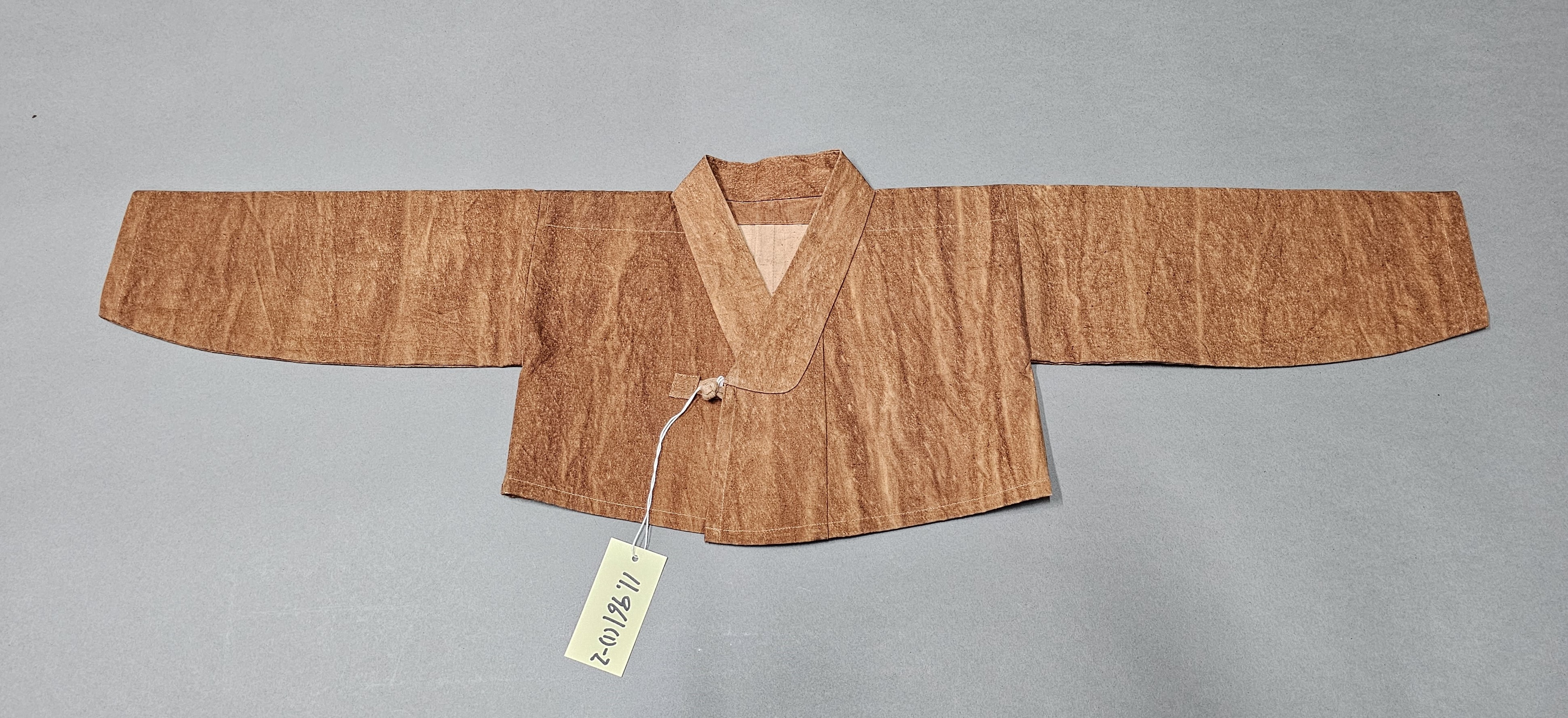 4) 설명: 감물 들인 여아용 상의임. 평상복으로 착용하였음. 섬유는 면임. 둥글레 깃에 매듭단추를 달았음.