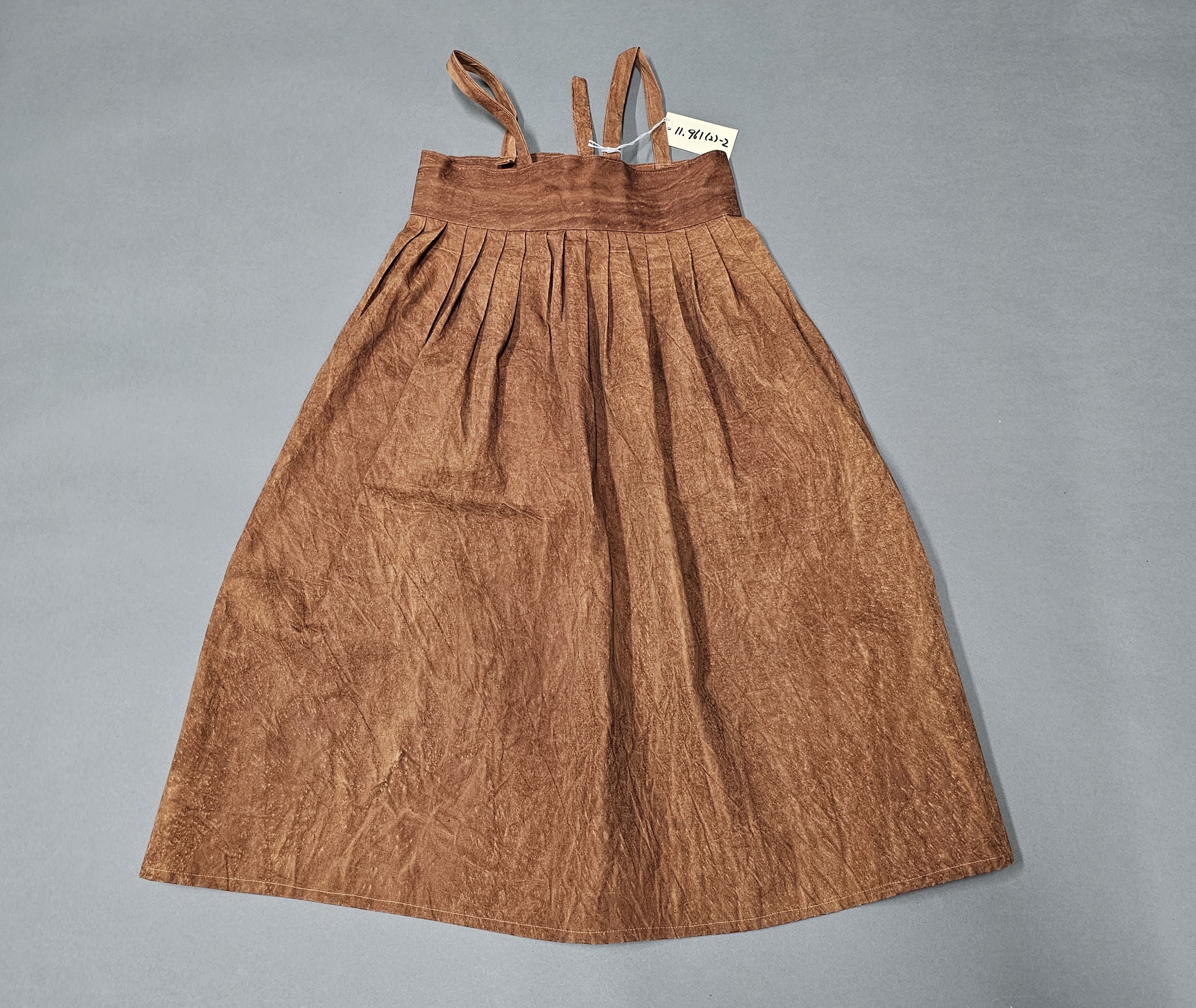 4) 설명: 감물 들인 여아용 치마임. 평상복으로 착용하였음. 섬유는 면임. 어깨걸이가 달려 있음.