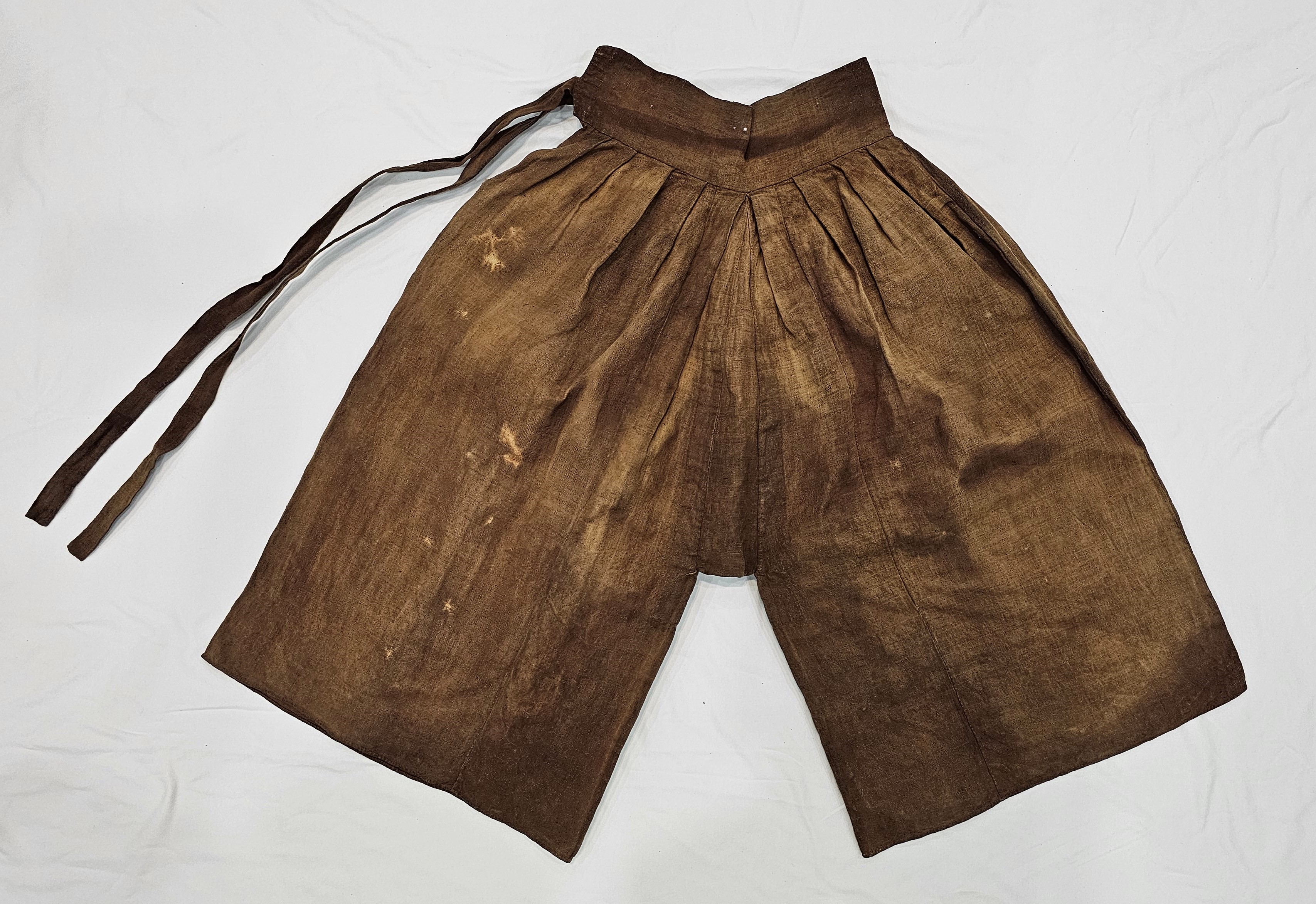 4) 설명: 감물 들인 여성용 하의임. 섬유는 면임. 허리에 말기와 그 끝에 끈 2개가 달려 있음. 바지 통이 바짓부리로 갈수록 넓어짐. 속옷인 '굴중의' 밑을 꿰메어 감물을 들인 다음 일복으로 착용하였음.