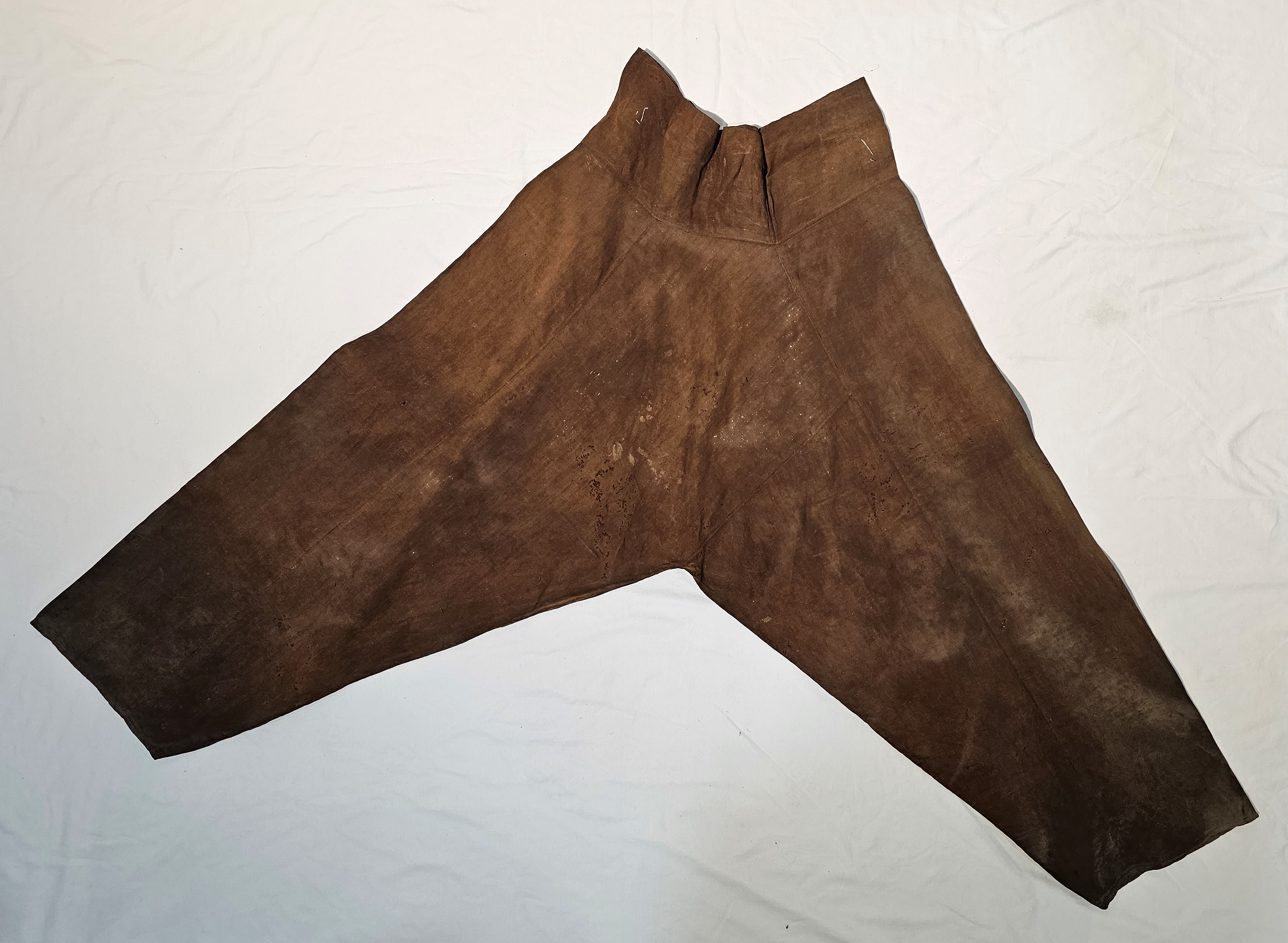 4) 설명: 감물 들인 남성용 하의임. 섬유는 면임. 허리에 말기가 달려 있음. 바지는 작은 사폭과 큰 사폭을 붙여 만들었음. 착용 시기는 조선시대로 추정됨.