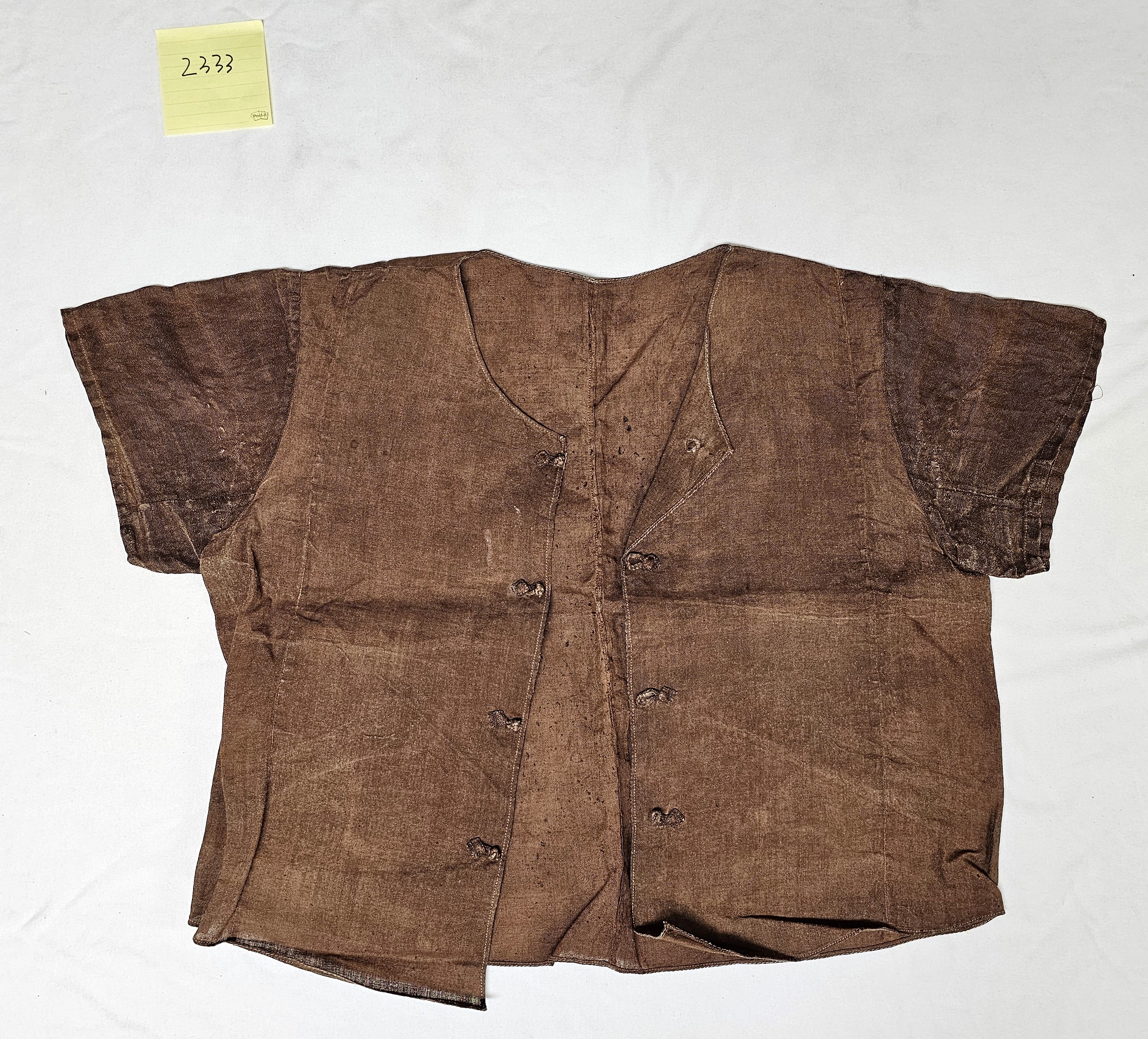 4) 설명: 삼베로 만든 반소매 적삼에 감물 들여 만든 상의임. 등솔은 재봉틀을 사용하였음. 옷 앞길에는 매듭단추 4개가 달려 있음.