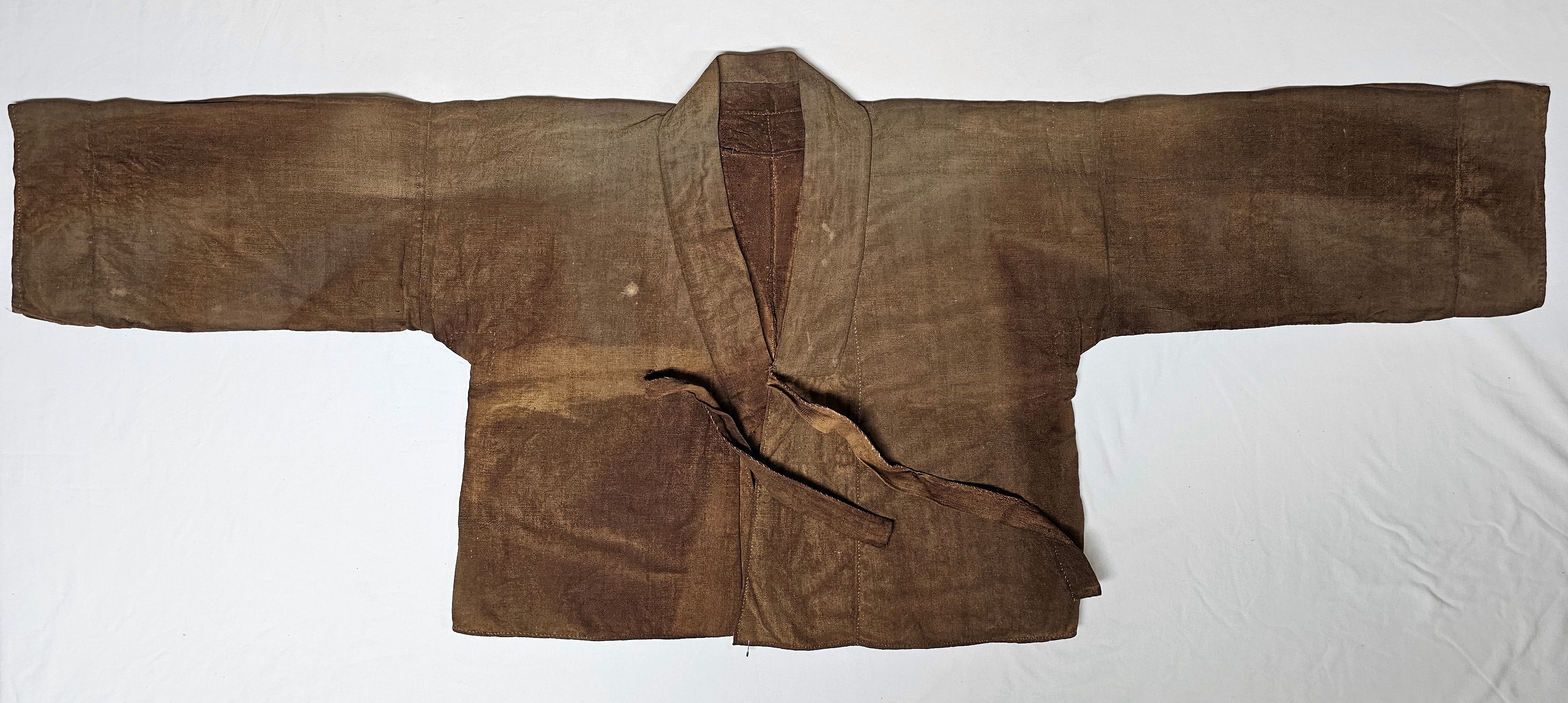 5) 설명: 감물 들여 만든 남성용 상의임. 등, 깃, 겨드랑이에 바대가 있음. 소매 끝에 덧댄 흔적이 있음. 고름 2개가 옷에 달려 있음.