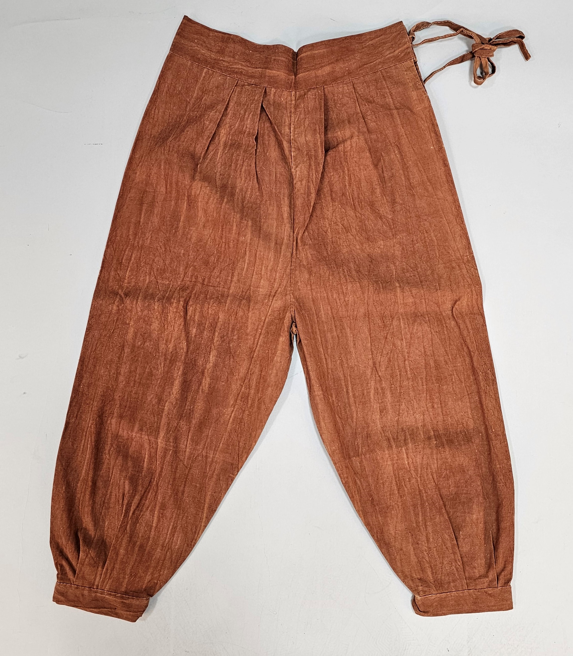 5) 설명: 감물을 들여 만든 여성 하의임. 몸뻬 형식의 바지로 허리에 말기를 달았으며 한쪽 옆은 트임. 트인 쪽으로 끈 2개가 달림. 바지통은 바짓부리로 갈수록 통이 좁아지며 단을 지었음.