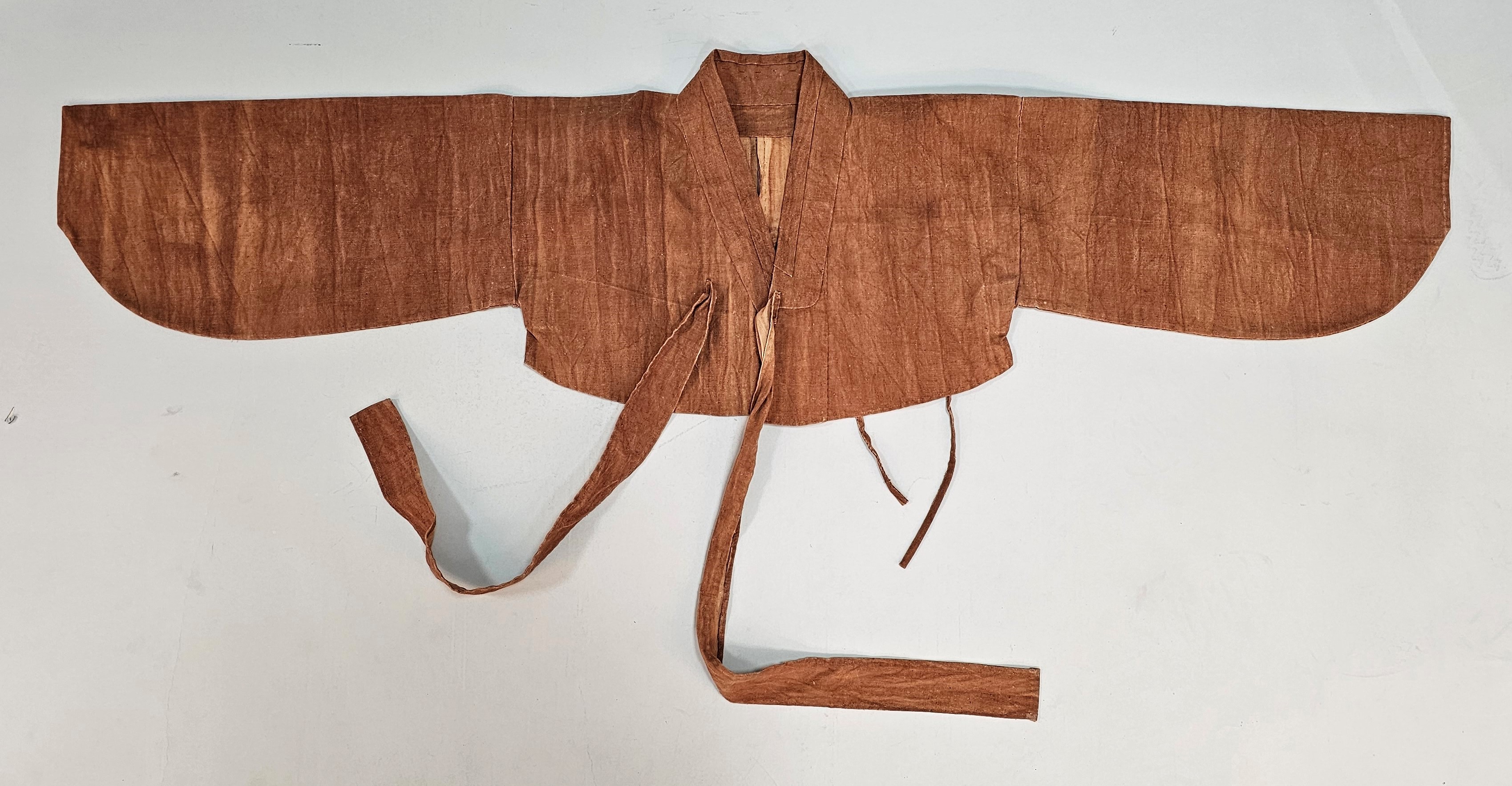 5) 설명: 감물들인 여성용 적삼으로 추정됨. 옷은 한복 저고리 형태임. 동전, 깃, 등과 겨드랑이 바대를 달았음. 소매로 갈수록 좁아짐. 깃에는 고름 2개가 있고, 적삼 안으로 안고름 2개가 달려있음.