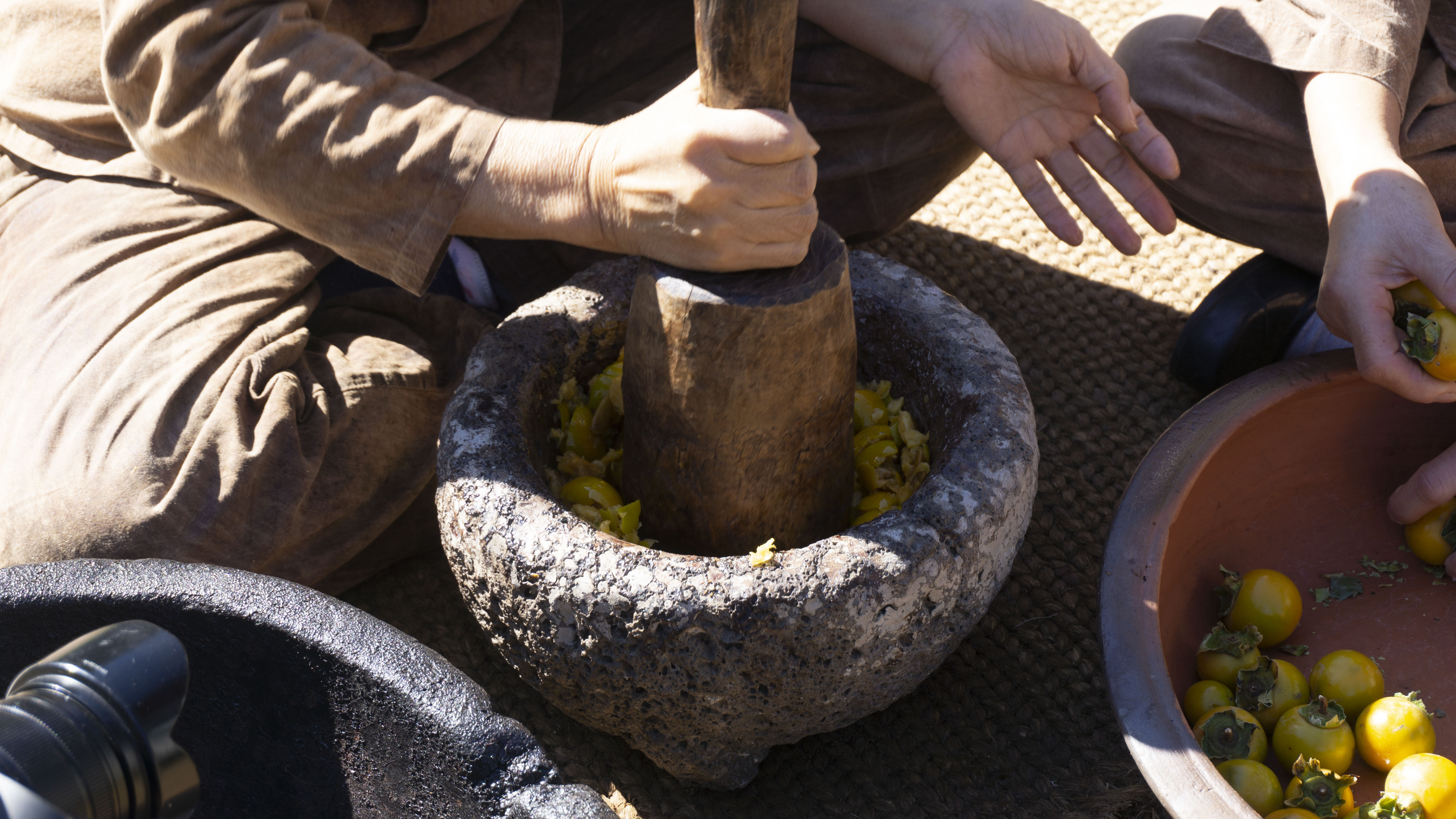 감물염색 시연자인 송심자 씨가 돌혹에 풋감을 넣 빻고 있다.
