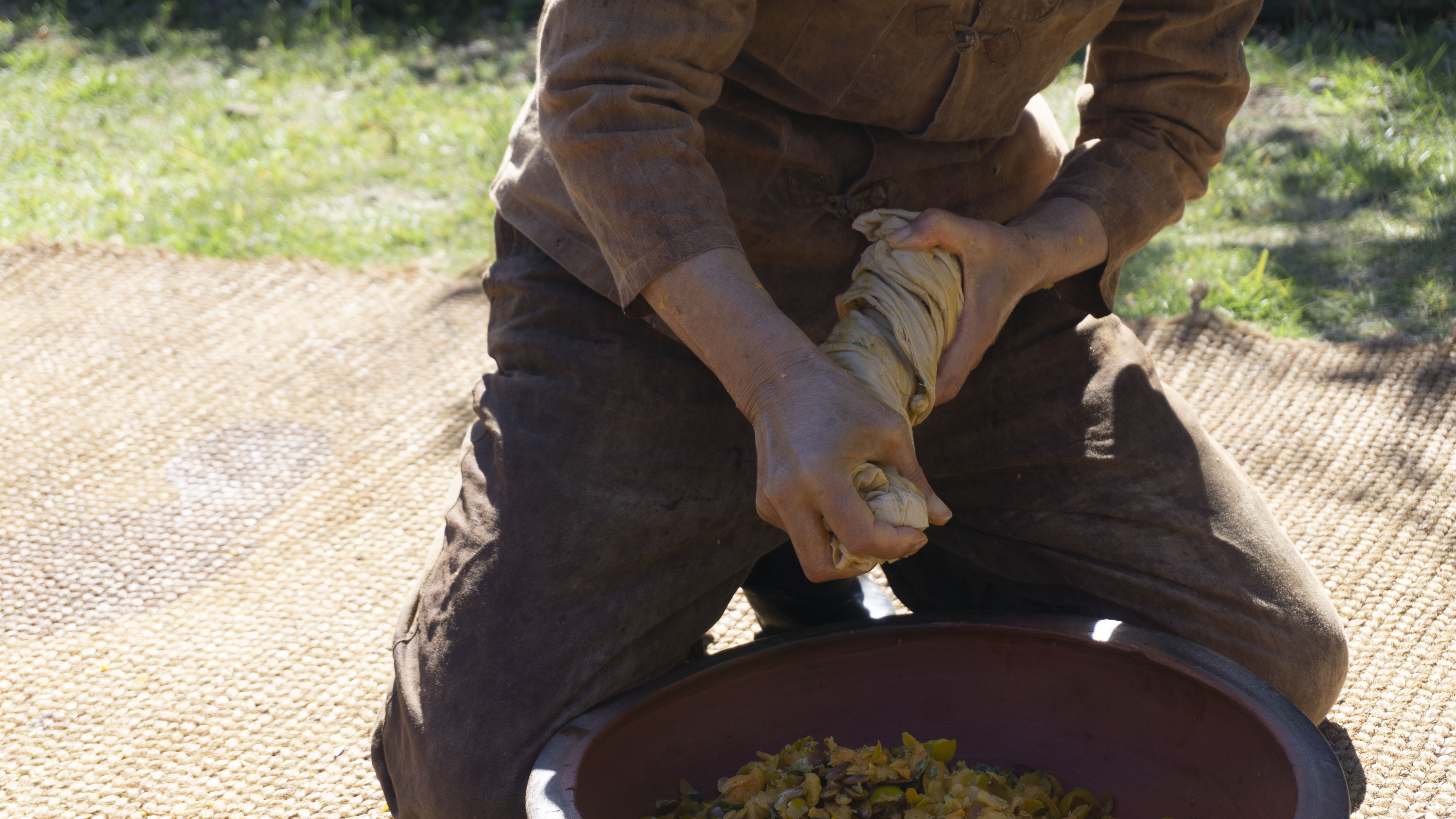 감물염색 시연자인 송심자씨가 감즙에 치댄 무명적삼을 꺼내서 짜고 있다.
