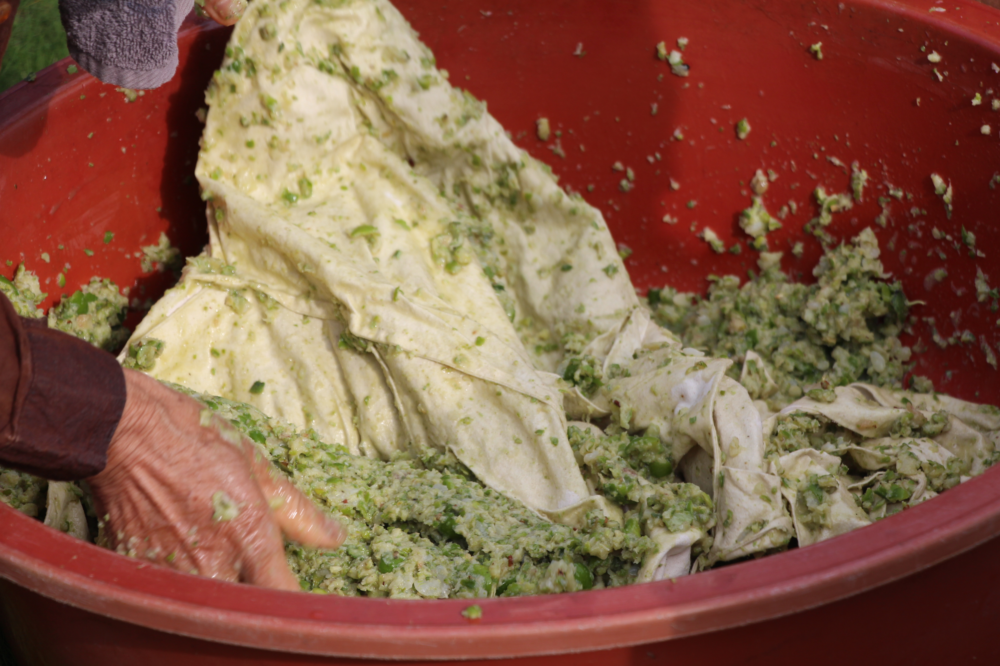 이날 시연을 해준 장태선 씨가 감물 들일 옷에 감즙을 발라가며 치대고 있는 장면이다.