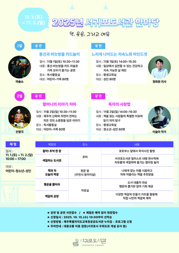 서귀포도서관(분관장 김병철)은 오는 11월 1일부터 2일까지 양일간 독서문화 축제 '2025년 서귀포도서관 한마당'을 개최한다.
