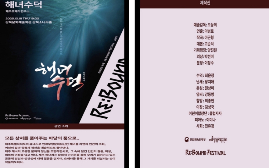 제주오페라연구소가 선보이는 창작오페라 ‘해녀 수덕’이 리바운드 페스티벌(RE:BOUND FESTIVAL) 공식 초청작으로 무대에 오릅니다.