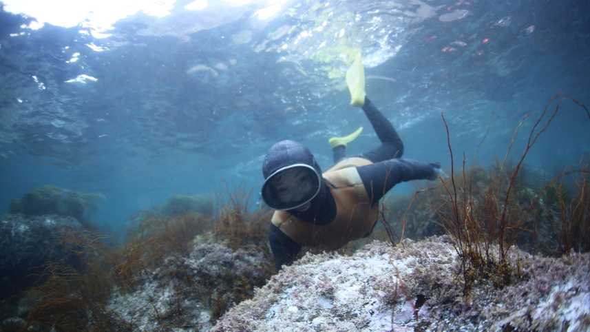 독도 몽돌해안에서 물질 시연을 하는 제주해녀. (제주도 제공)