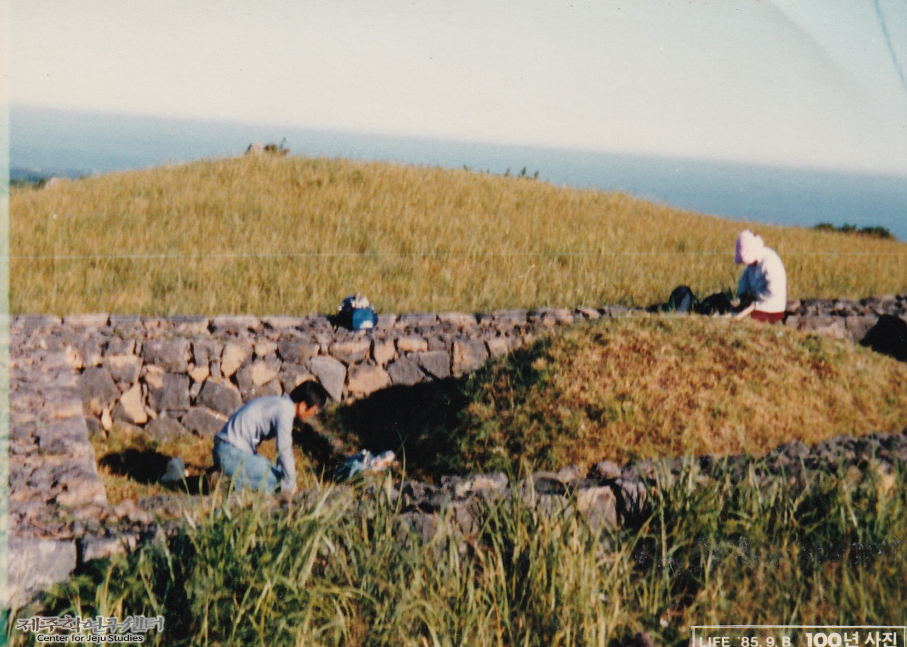 소장자 강홍종 씨가 팔월 추석을 맞아 유수암리에 있는 강씨 집안 조상묘에서 벌초를 하고 잔을 올리며 제를 지내는 모습이다. 뒤쪽에서는 숙모가 봉분을 어루만지고 있다.