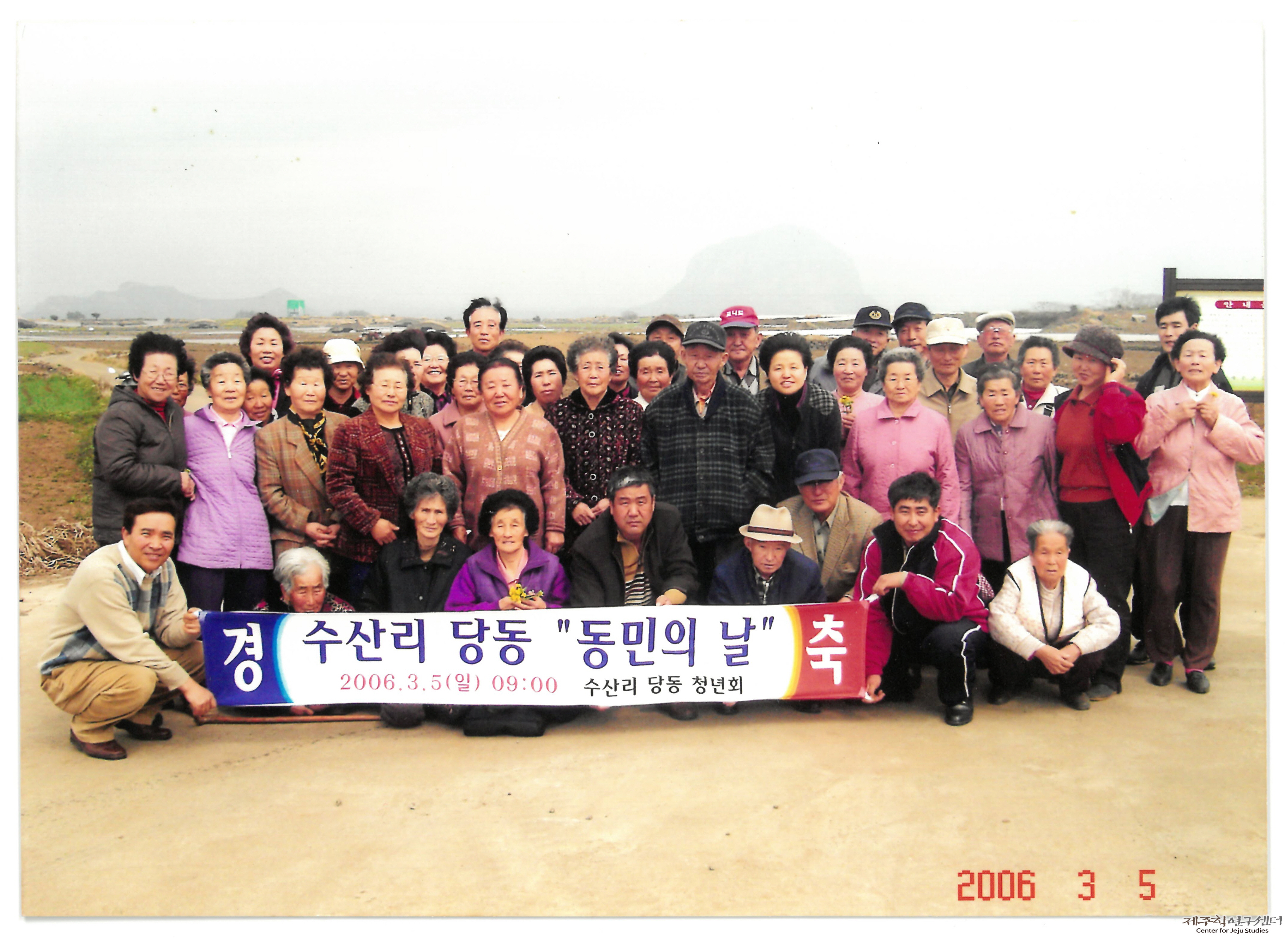 애월읍 수산리 ‘당동’ 동민의 날 기념사진이다. 수산리 당동 청년회가 진행하는 이날 당동 어르신들이 모여 대정읍 일대를 여행했다고 한다. 맨 앞줄에서 오른쪽 네 번째 앉아 있는 사람이 소장자 고영주 씨다.