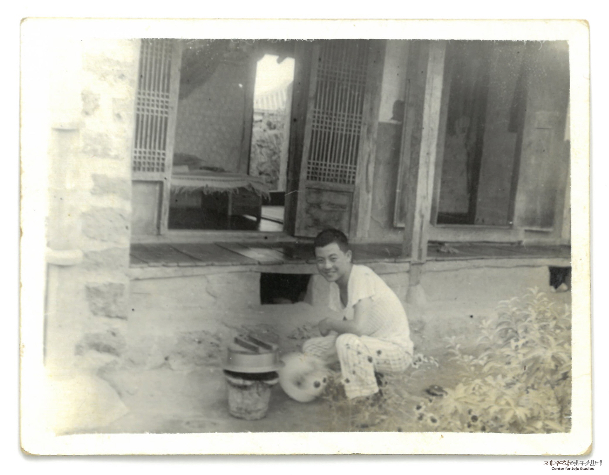 제주상업고등학교 3학년에 재학 중이던 소장자 홍행기 씨가 제주시 묵은성 인근 자취방 마당에서 ‘간데기(숯풍로)’를 이용하여 밥을 준비하는 모습이다. 당시 원거리에서 통학하던 학생들은 학교 근처에서 자취하는 경우가 흔했다고 한다.
