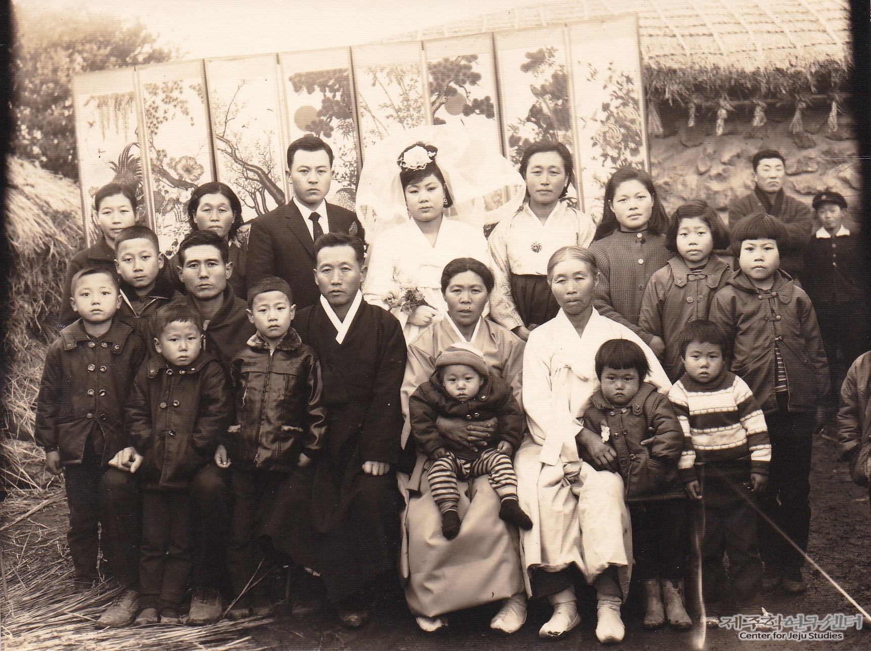 소장자 홍행기 씨와 강정자 씨 혼례 기념사진이다. 이웃에서 빌려온 8폭 병풍을 배경을 하고 앞줄은 두루마기를 착용한 부친과 모친, 조모님이 앉아 있다. 새신랑과 새신부를 중심으로 좌우로 숙부 내외, 사촌과 친동생들이 서 있다. 한편, 사진 속에 병풍 뒤로 옛 초가 ‘안거리(안채)’와 ‘눌(가리)’가 일부 보인다.