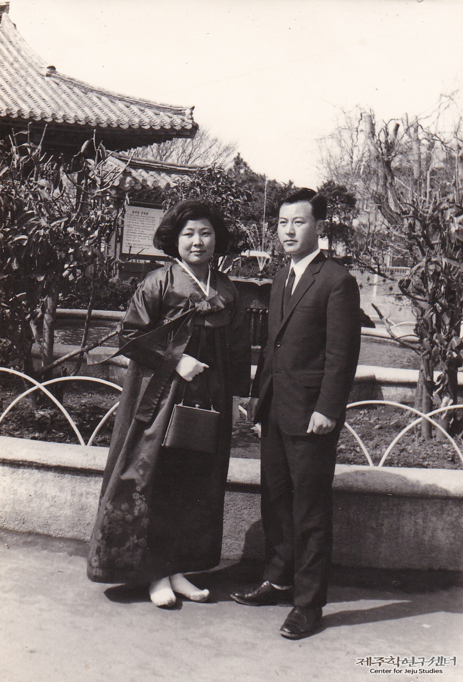 제주 관덕정 분수대 광장을 배경으로 촬영한 홍행기, 강정자 씨 신혼 기념 사진이다. 제주에서는 신혼여행이 희박했을 당시 두 부부는 예식을 끝내고 제주시 관덕정 분수대 광장으로 야유회 겸 여행했다고 한다.