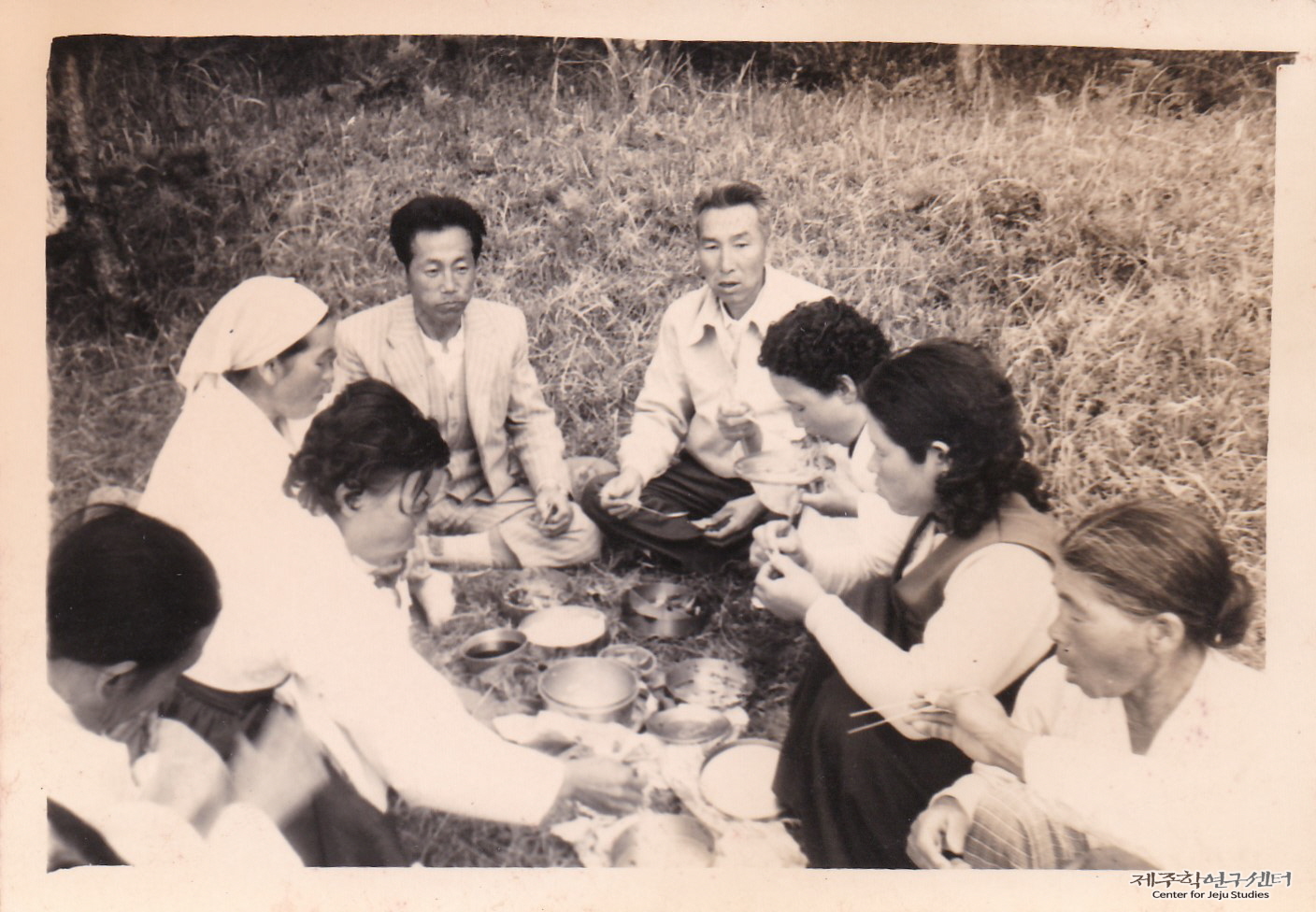 소장자 강남승 씨와 일가 친척들이 야외 나들이를 나가 식사하며 담소를 즐기는 모습이다. 사진 오른쪽은 형수님이, 중앙에는 삼촌 항렬 어른이 자리하고 있다. 당시 나들이는 직접 음식과 그릇을 준비하고 야외에서 서로 나눠 먹는 것이라고 한다. 강남승 씨 일가도 둥그런 반합에 밥과 반찬을, 주전자에 물을 담고서 갔다고 한다. 장소는 애월읍 일대로 추측하고 있다.