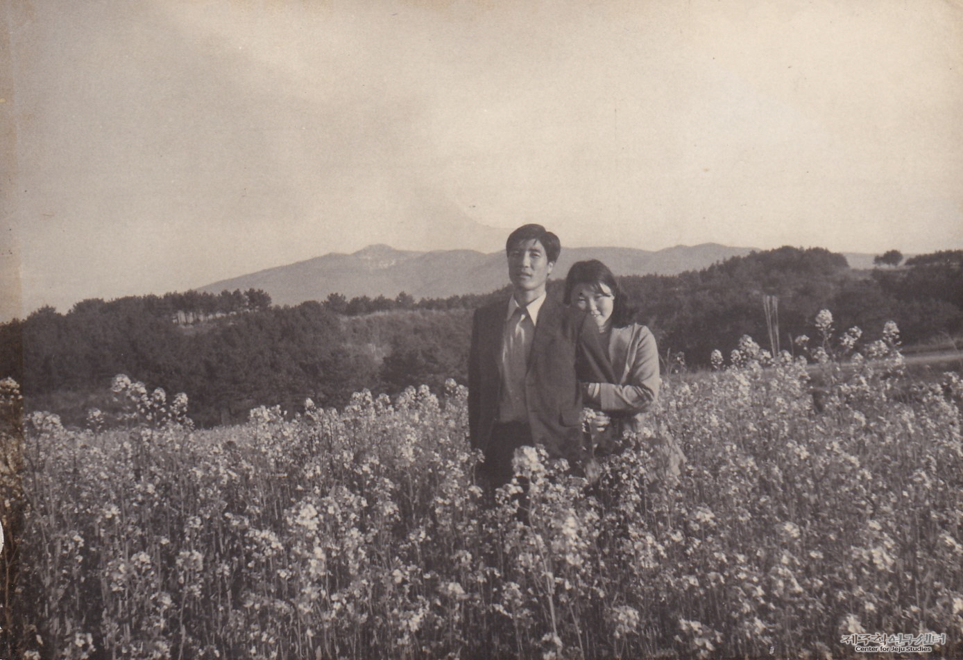 소장자 전경순 씨 부부가 약혼을 기념하여 무수천변 유채꽃밭 나들이를 가서 찍은 사진이다. 유채꽃이 만발한 무수천 들판과 그 뒤로 희미하게 보이는 한라산 전경을 담고 있다. 전경순 씨 설명에 따르면 배경이 되는 이곳은 현재 여러 건축물이 생기면서 유채꽃밭 등이 사라졌다고 한다.