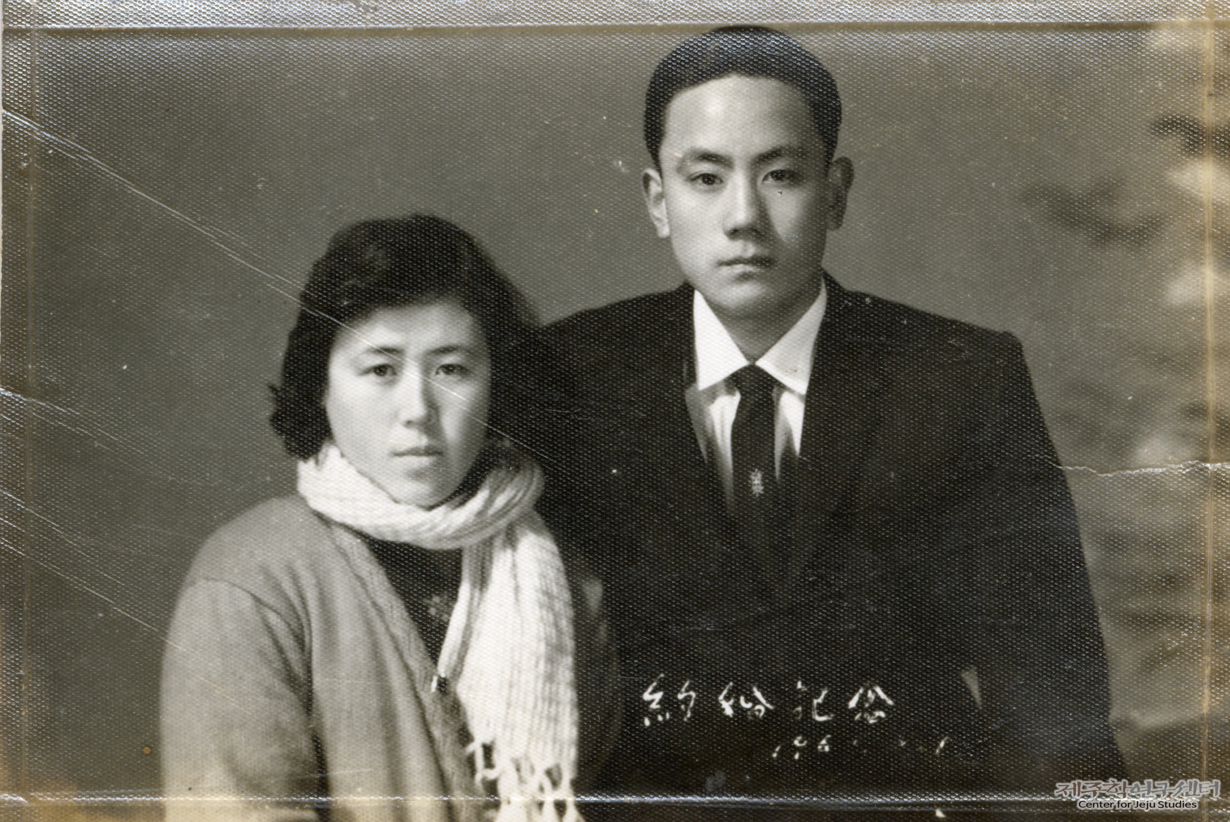 신부 강옥순 씨와 신랑 양덕중 씨 약혼 사진이다. 두 사람은 애월읍에 있는 한 사진관에서 기념 사진을 찍는 것으로 약혼식을 대신하였다. 사진 속 양덕중 씨는 단정한 양복을 갖춰 입었고 강옥순 씨는 소박한 차림에 목도리를 두르고 있다. 두 사람은 약혼 기념 사진을 찍고서 2년 후 1963년 2월에 결혼식을 올렸다고 한다. 사진 하단에는 '약혼기념 196□. □. □.'이라고 희미하게 적혀 있다.