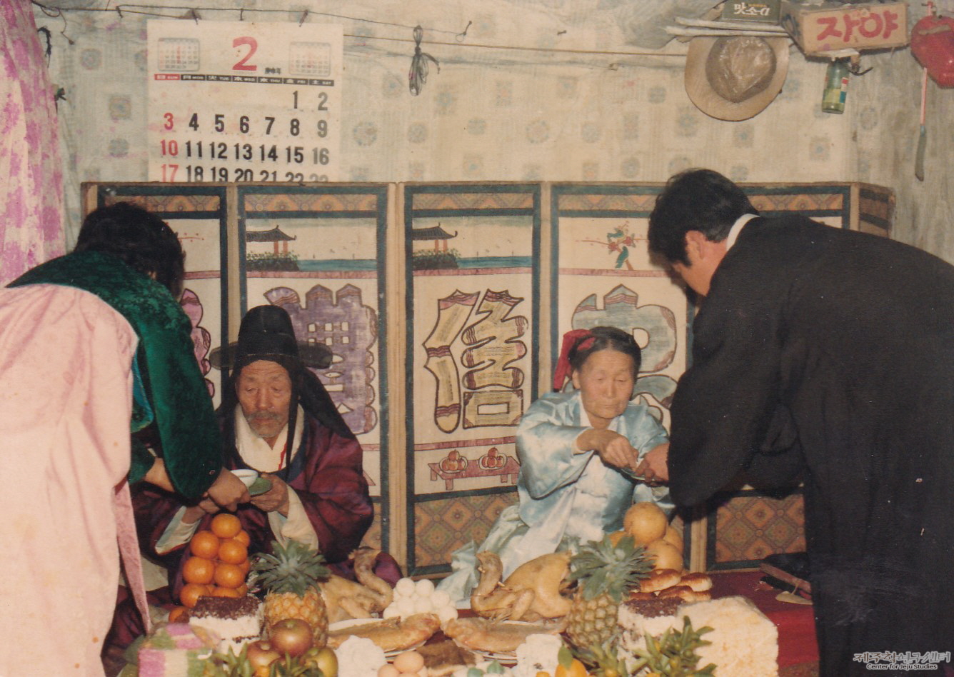 소장자 양용규 씨 장인과 장모가 혼례 60주년을 맞이하여 치른 회혼례(回婚禮) 사진이다. 장인은 자주색 관복을 입고 휘건 위에 사모를 갖춰 썼다. 한편 장모는 비취색 한복을 입고 댕기와 같은 붉은색 계열의 머리 장식을 하였다. 한편 두 부부 뒤로 문자도 병풍을 세워 잔치 분위기를 냈다. 이 문자도는 '예(禮), 신(信), 충(忠)' 등 유교 덕목을 상징하는 글자를 그림으로 풀어낸 병풍을 말한다. 회혼례 상에는 사과, 배, 파일애플, 시루떡, 씨암탉, 생선 등을 올렸다.