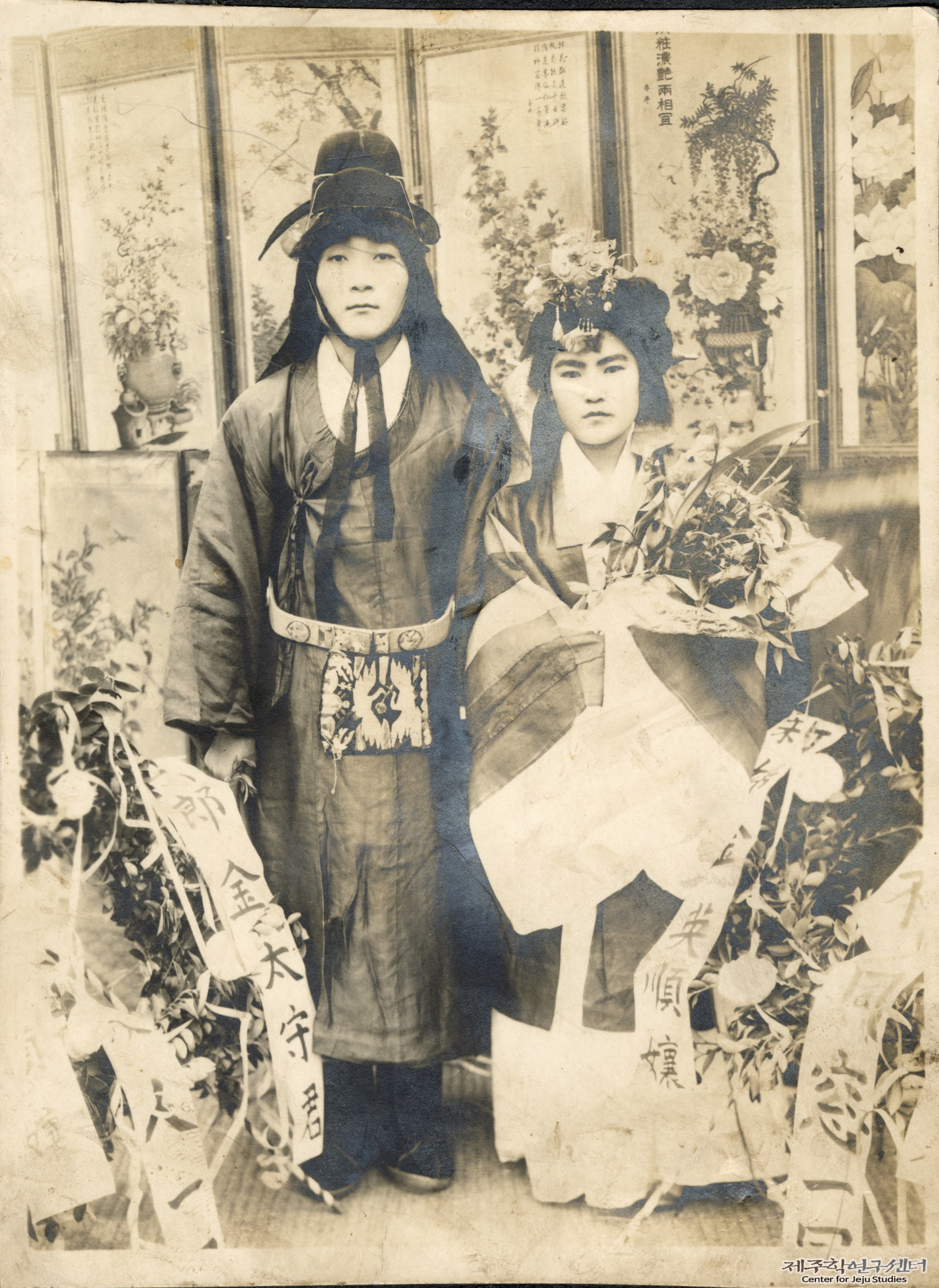 애월읍 수산리 토박이인 신랑 김태수(26세) 씨와 신부 김영순(23세) 씨가 마을 사람 중매를 통해 인연을 맺고 혼례식을 치른 후 촬영한 부부 사진이다. 두 사람은 전통 혼례 복장을 갖추고 있다. 신랑은 사모를 쓰고 관복을 입었으며 신부는 족두리를 쓰고 소매가 긴 원삼을 착용하였다. 신부 손에는 생화와 동백잎을 엮어 만든 부케가 들려 있다. 부부 뒤로 화려한 화조도를 새긴 병풍을 둘러 잔칫날 분위기를 더했고 앞쪽에는 신부 지인이 정성껏 꾸며준 화환을 놓았다. 왼편 화환에는 '신랑 김태수 군', 오른편에는 '신부 김영순 양'이라는 문구가 한자로 적혀 있다.
