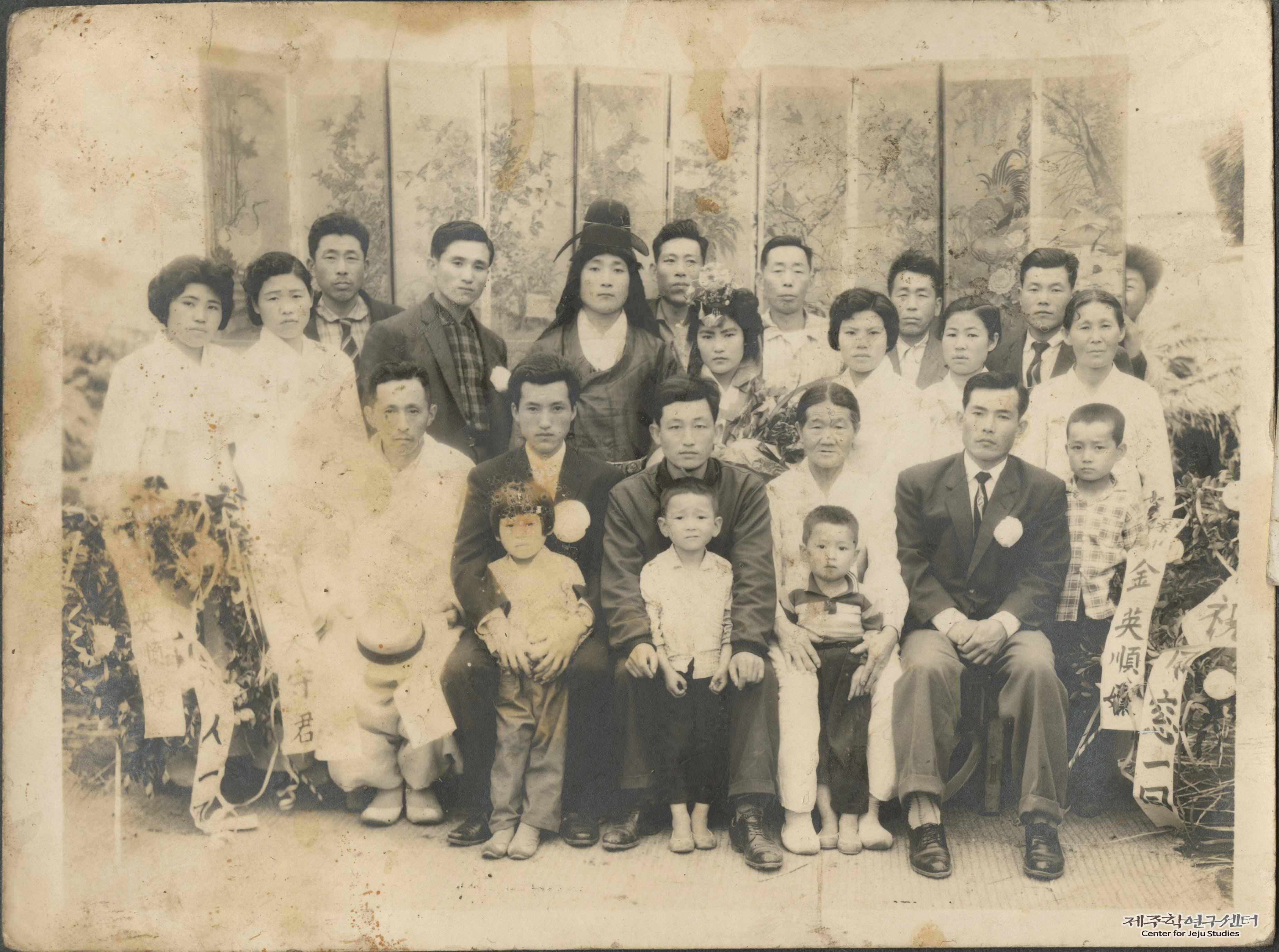 김태수 씨와 김영순 씨의 혼례를 기념하여 촬영한 단체 사진이다. 수산리 토박이인 두 사람의 혼례를 축하하기 위하여 친족과 지인들이 모였다고 한다. 사진 중앙에 서 있는 신랑신부는 전통 혼례복을 입었다. 한편 사진 속 인물을 살펴보면 사회자와 부신랑은 양복 차림에 하얀 꽃사지를 달고 있으며, 친족들은 양복 또는 한복을 정갈하게 차려 입었다. 인물 주변엔 혼례 분위기를 나타내는 10폭 병풍과 화환이 놓여 있다. 병풍은 화조도가 그려졌고 화환에는 신랑과 신부 이름이 적힌 종이가 달려 있다.