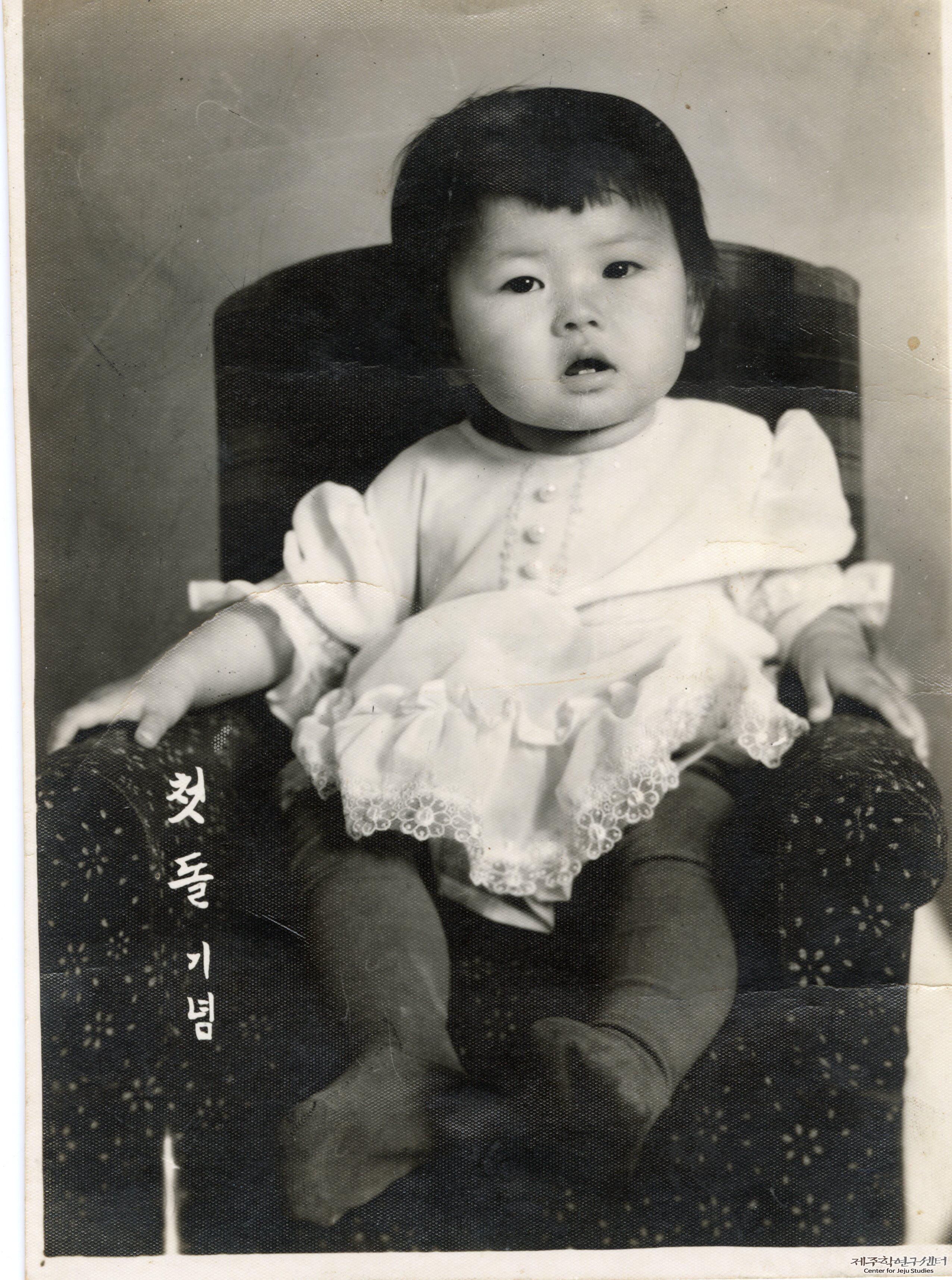 박송자 씨 첫째 딸의 첫돌을 맞이하여 사진관에서 촬영한 기념 사진이다. 당시 돌잔치 대신 첫 생일을 기념하여 전문 사진관에서 사진을 찍는 일이 보편적이었다. 박송자 씨 첫째 딸은 당시 유행하던 서구식 드레스를 입고 스타킹을 신었다.