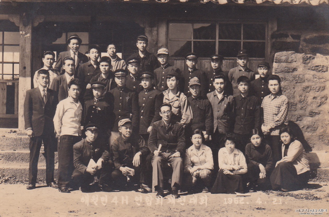 애월면 4H 연합회 개편 대회를 기념하여 촬영한 사진이다. '4H 연합회 개편 대회'는 지역 농촌 청소년 4H 조직을 정비하기 위한 행사를 말한다. 당시 애월면 각 마을 단위로 나눠져 있던 4H 모임을 '애월면 연합회'로 통합하면서 면 단위로 이끌어갈 연합회장과 간부를 새로 선출했다고 한다. 이날 강군자 씨 남편 양행정 씨를 포함한 청년들이 새로운 간부로 뽑았다. 사진 속 인물들은 교복을 입거나 자율복장을 하고 있다. 사진 하단에 '애월면 4H 연합회 개편 대회 1962. 4. 21.'이라고 적혀 있다.