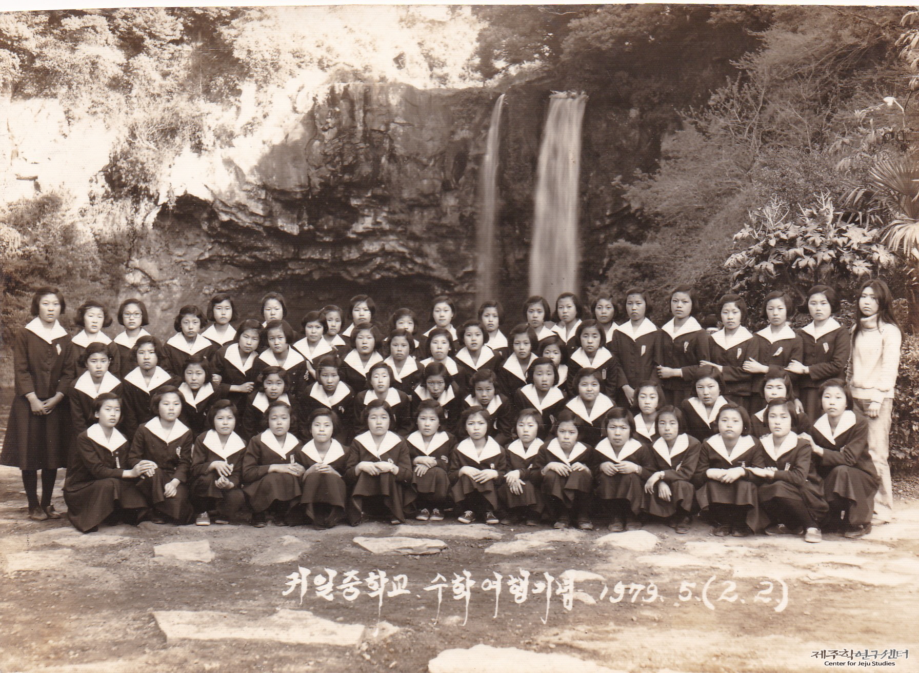 소장자 강홍종 씨 작은 누이동생이 귀일중학교 2학년 때 촬영된 수학여행 기념사진이다. 2학년 2반 학생들이 천지연폭포 앞에 모여 촬영한 것으로 보인다. 사진 하단에는 ‘귀일중학교 수학여행기념 1979. 5.(2. 2)’라고 적혀 있다.