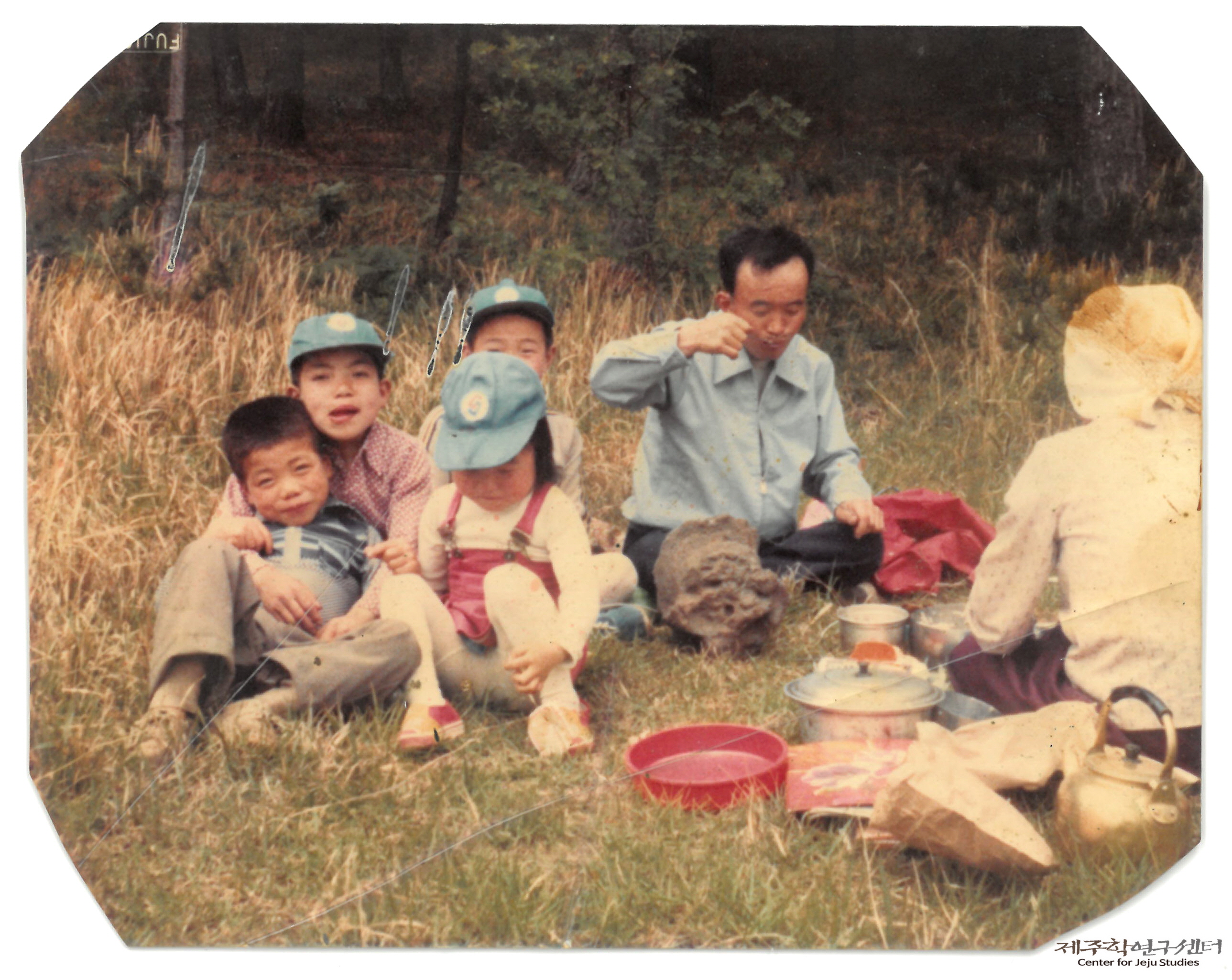 소장자 고영주 씨와 아이들이 수산봉으로 소풍 갔던 모습이다. 밥과 멸치 반찬 같은 한 두 가지와 찐 고구마를 챙겼고, 밥은 식지 않도록 솥째 들고 주전자에 물을 담아 수산봉을 올랐다고 한다. 사진 왼쪽부터 외사촌 간 아이들과 고영주 씨, 등지고 앉아 있는 처남댁이라고 한다.