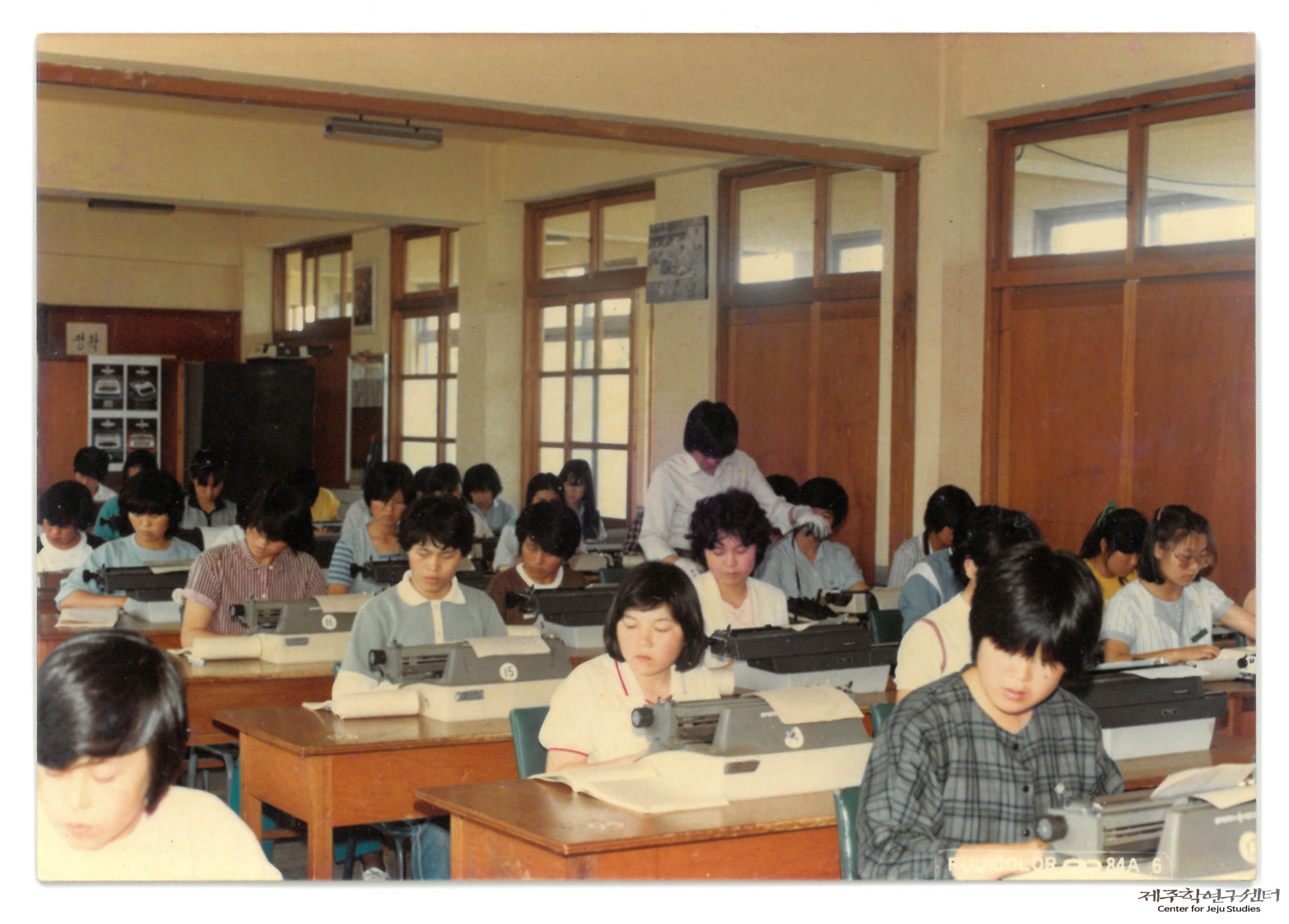 1980년대 제주여자상업고등학교 교실에서 학생들이 타자 연습에 몰두하는 모습이다. 소장자 고영주 씨 큰딸이 재학하던 시절로, 여럿 학생이 타자 교재를 옆에 두고 자판을 두드리는 모습이다. 당시 타자 수업은 상업 계열 고등학생에게 필수적인 교과과정이었다고 한다.