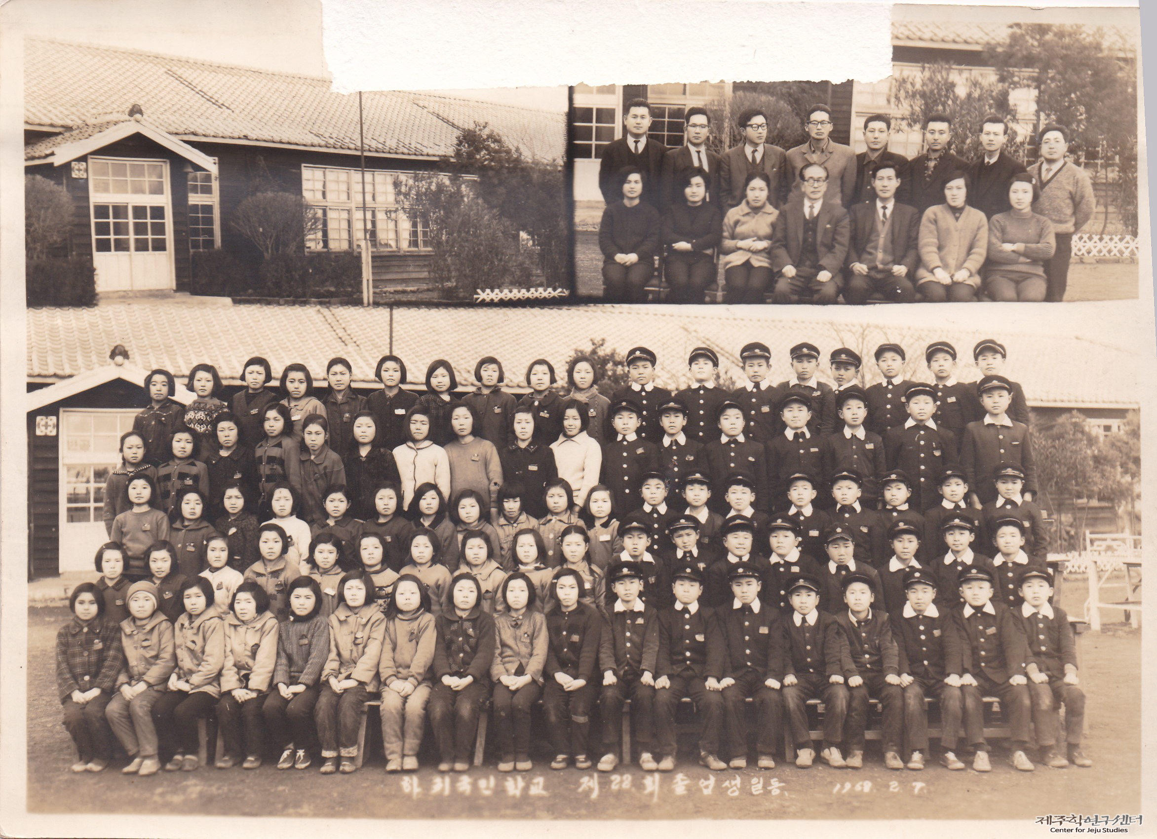 1968년 하귀국민학교(현 하귀초등학교) 졸업을 기념하여 졸업생 전원과 교직원이 학교 중앙 에 모여 촬영한 사진이다. 당시 하귀국민학교 6학년은 2학급이다. 사진 속 남학생들은 검은색 교복과 교모를 착용하였고, 여학생들은 단정한 자율 복장에 머리를 묶거나 귀밑 단발을 하였다. 또 사진 중앙에는 전영재 교장과 교감, 각 학년 담임 교사들이 있다. 한편 뒤로 보이는 하귀국민학교 건물은 큰 유리창과 각진 지붕이 특징적이라 할 수 있다.