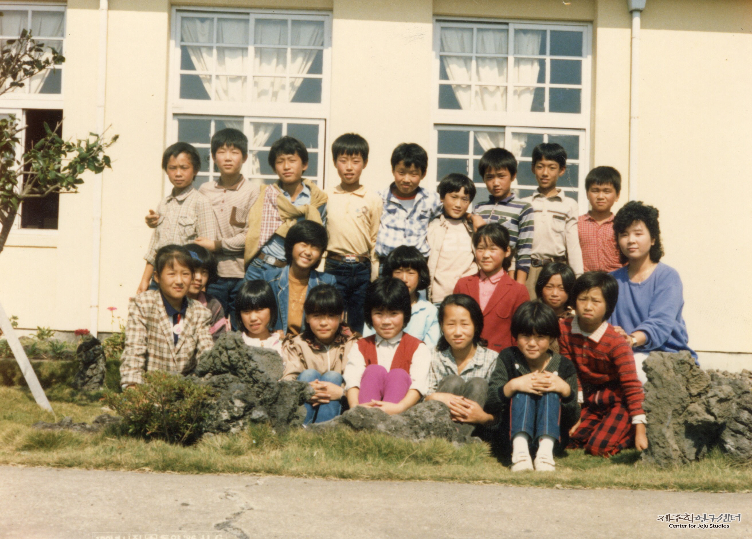 소장자 전경순 씨 딸이 물메초등학교 5학년 때 담임 선생님과 같은 반 학생들이 모여 찍은 사진이다. 지금과 달리 학교는 흰색 페인트로 색칠되어 있고 그 앞에 꽃밭이 조성되었다고 한다. 당시 한 반에 20명 남짓 인원이었고 남녀 합반이었다고 한다.