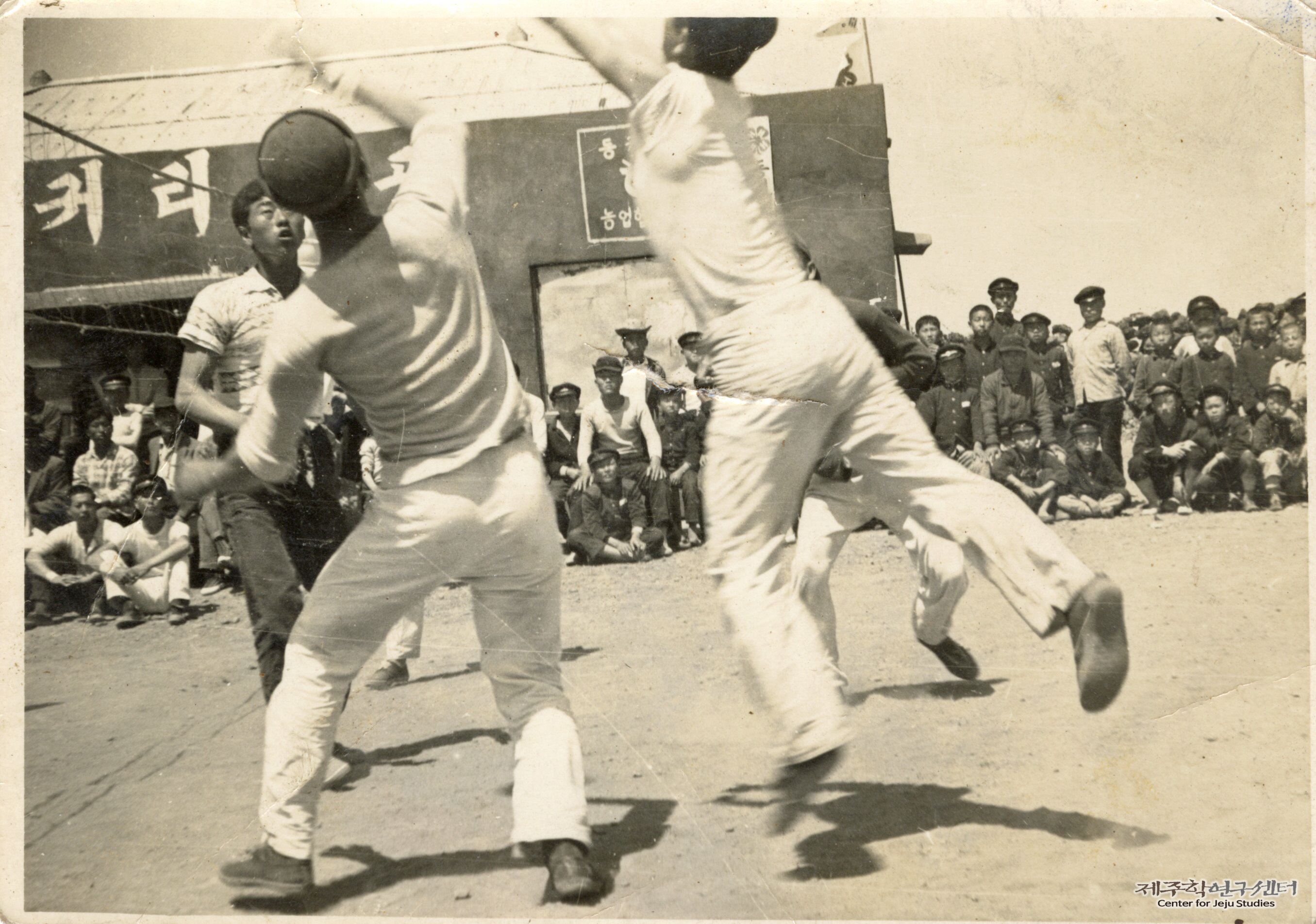 귀일중학교 학생들의 교내 배구 시합 모습이다. 선수들 뒤편으로 보이는 '귀리'라는 글자를 통해 보면 배구 시합은 하귀농협 앞 공터에 마련된 간이 경기장에서 치러졌음을 추정할 수 있다. 사진에는 체육복을 입은 선수들이 공을 향해 공중으로 높이 뛰어오르고 있으며, 경기장 주변을 빽빽하게 둘러싼 학생과 선생님들이 경기를 관람하고 있다.