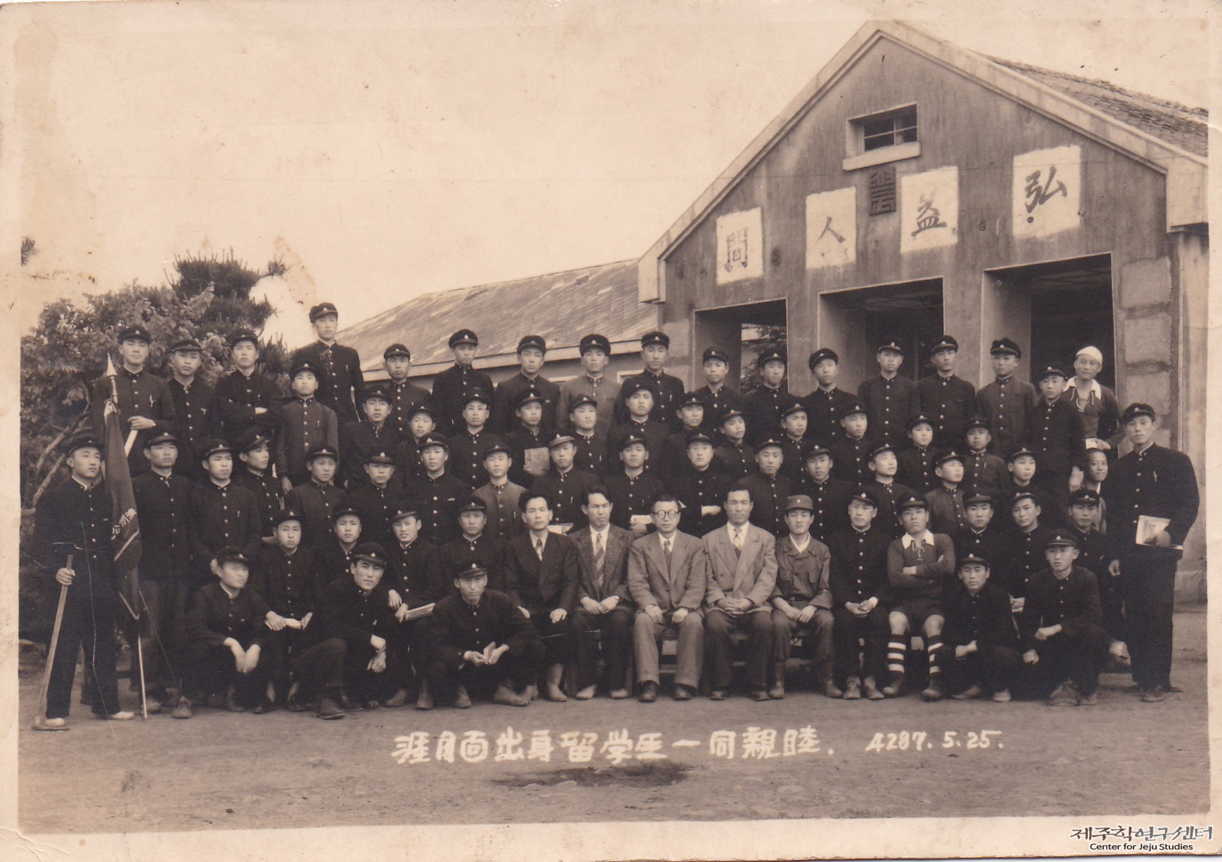 소장자 양용규 씨가 제주농업학교(현 제주고등학교) 입학 당시 촬영한 사진이라고 한다. 당시 애월면 출신 학생들이 모여 친목을 다지기 위하여 촬영한 사진이라고 한다. 학교 본관으로 보이는 건물에 '홍익인간' 한자가 걸려 있다. 사진 하단에는 '애월면 출신 유학생 일동 친목. 4287. 5. 25.’라고 적혀 있다. 여기서 '유학생'은 제주시내 외 출신 학생들을 이르는 말이다.