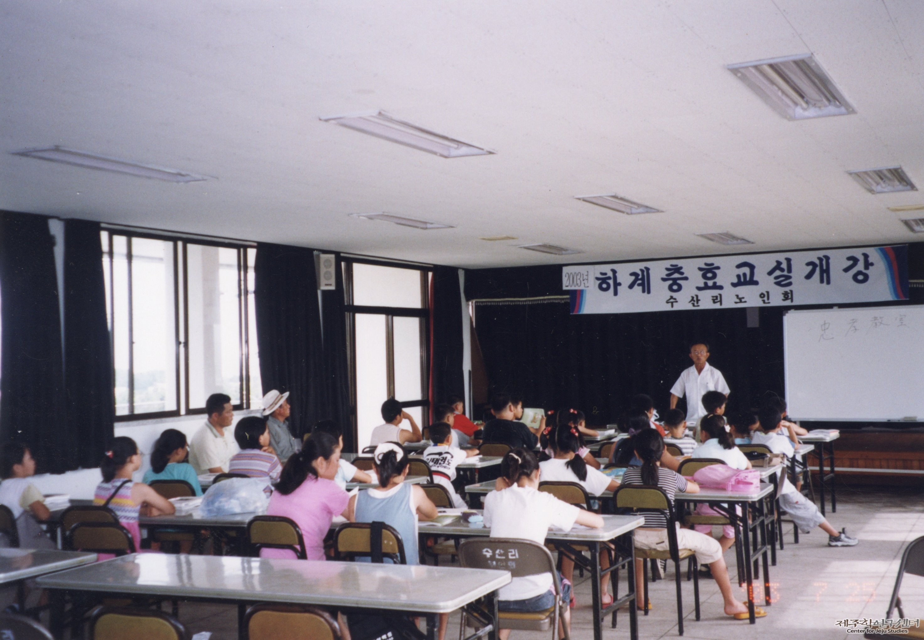 애월읍 수산리에서 마을 어린이들을 대상으로 운영한 ‘하계 충효교실’ 개강식 기념 사진이다. 당시 수산리 마을에서는 매년 여름방학마다 물메초등학교 학생들을 대상으로 충효 교실을 열어 전통 예절과 충효 사상을 가르쳤다고 한다. 2003년 당시 수산리 노인회장이었던 소장자 양용규 씨와 노인회 회원들이 번갈아 일일 교사가 되어 아이들을 지도하였다고 한다.