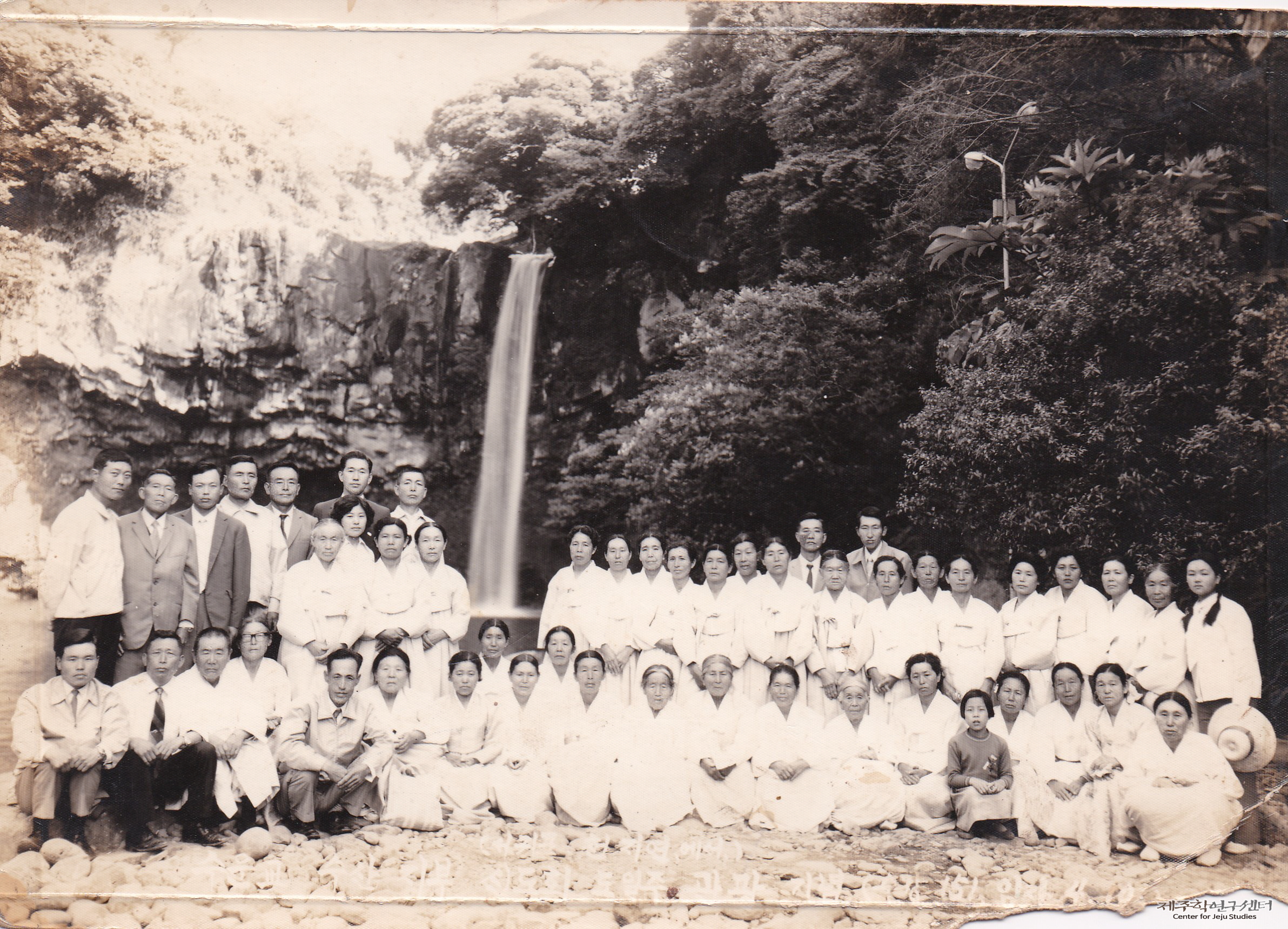 수운교 단체 관광 중 서귀포 천지연폭포에서 촬영한 사진으로 보인다. 사진 오른쪽에서 여덟 번째로 서 있는 인물이 제보자 강홍종 씨 어머니 故고옥규(1924년생) 씨다. 당시 여자 어른은 흰색 한복에 고무신을 착용하였고 남자 어른은 양복 차림을 하여 나들이를 다녔다고 한다. 사진 하단에는 ‘(서귀포 천지연에서) 수운교 수산지부 신도회 도 일주 관광 기념(수강 151, ■■ 4.10)’이라고 적혀 있다.