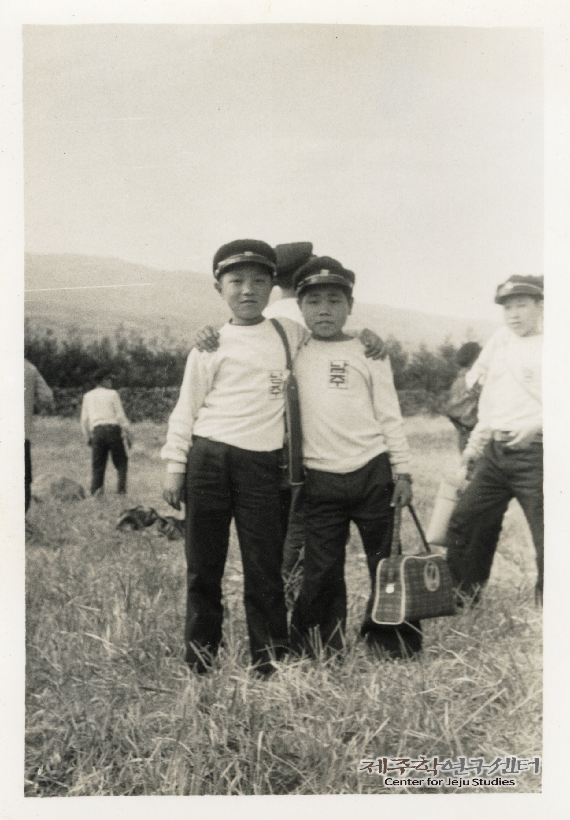 4) 사진 설명: 남주중학교 소풍을 기념하여 촬영한 사진이다. 상의는 왼쪽 가슴 팍에 '남주'라는 글자를 새긴 교련복을 입고 검은색 모자를 썼다. 두 학생은 나란히 어깨동무를 하고 있다.