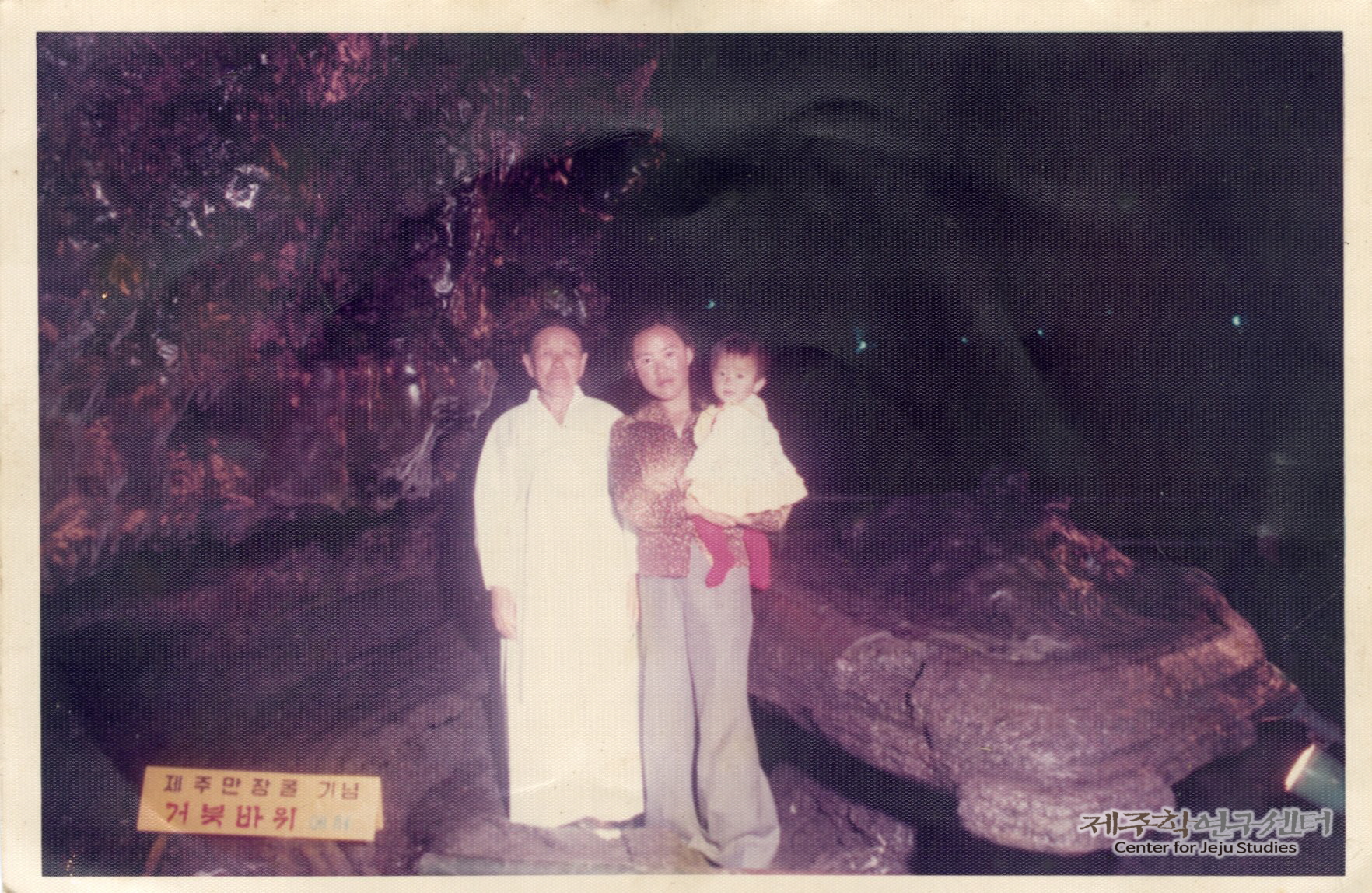 4) 사진 설명: 박근실 씨의 어머니와 작은 누님, 외조카가 제주 만장굴을 방문한 기념으로 만장굴 거북바위 앞에서 촬영한 사진이다. 만장굴은 제주시 구좌읍 동김녕리에 있는 용암 천연 동굴로, 이곳은 용암이 분출하면서 돌기둥, 돌거북 등이 형성되었고 많은 관광객이 찾는 경승지다. 그중 돌거북은 돌의 형상이 거북이와 비슷하다고 하여 거북바위라고 명하였고 많은 사람들이 그 앞에서 기념 촬영을 하였다고 한다.