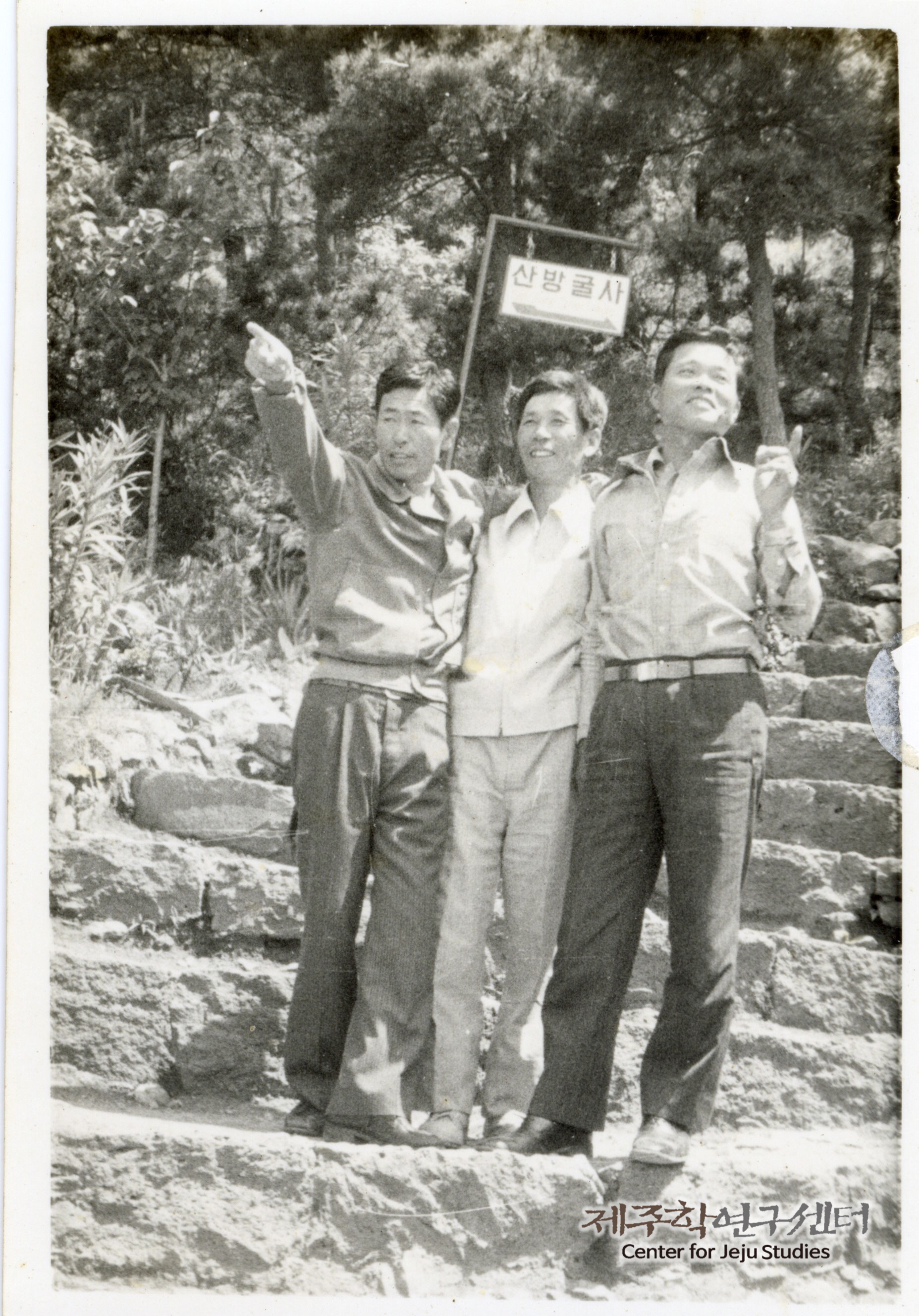 4) 사진 설명: 제주도 산방산과 산방굴사 관광을 기념하여 촬영한 수망리 친목회의 사진이다. 산방굴사는 안덕면 사계리 산방산에 위치한 자연동굴 안에 있는 사찰이다. 그곳 사찰을 향하는 수망리 사람들이 돌계단 위에서 촬영한 것이다. 사진 속 맨 왼쪽에 서 있는 사람이 사진 소장자 박근실 씨이다.
