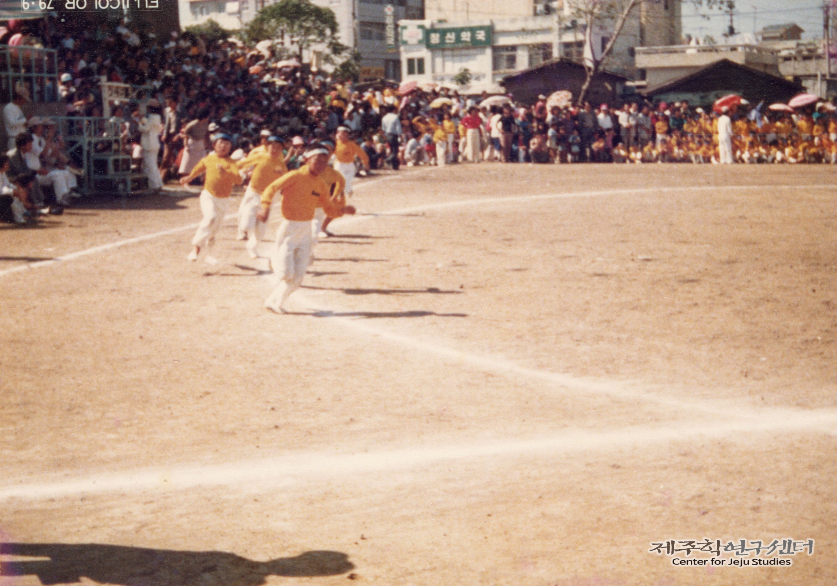 4) 사진 설명: 1979년 남초등학교 새마을체육대회에서 학생들이 계주를 하고 있다. 운동장 주변을 둘러싼 학생들과 학부모들이 응원하고 있다.