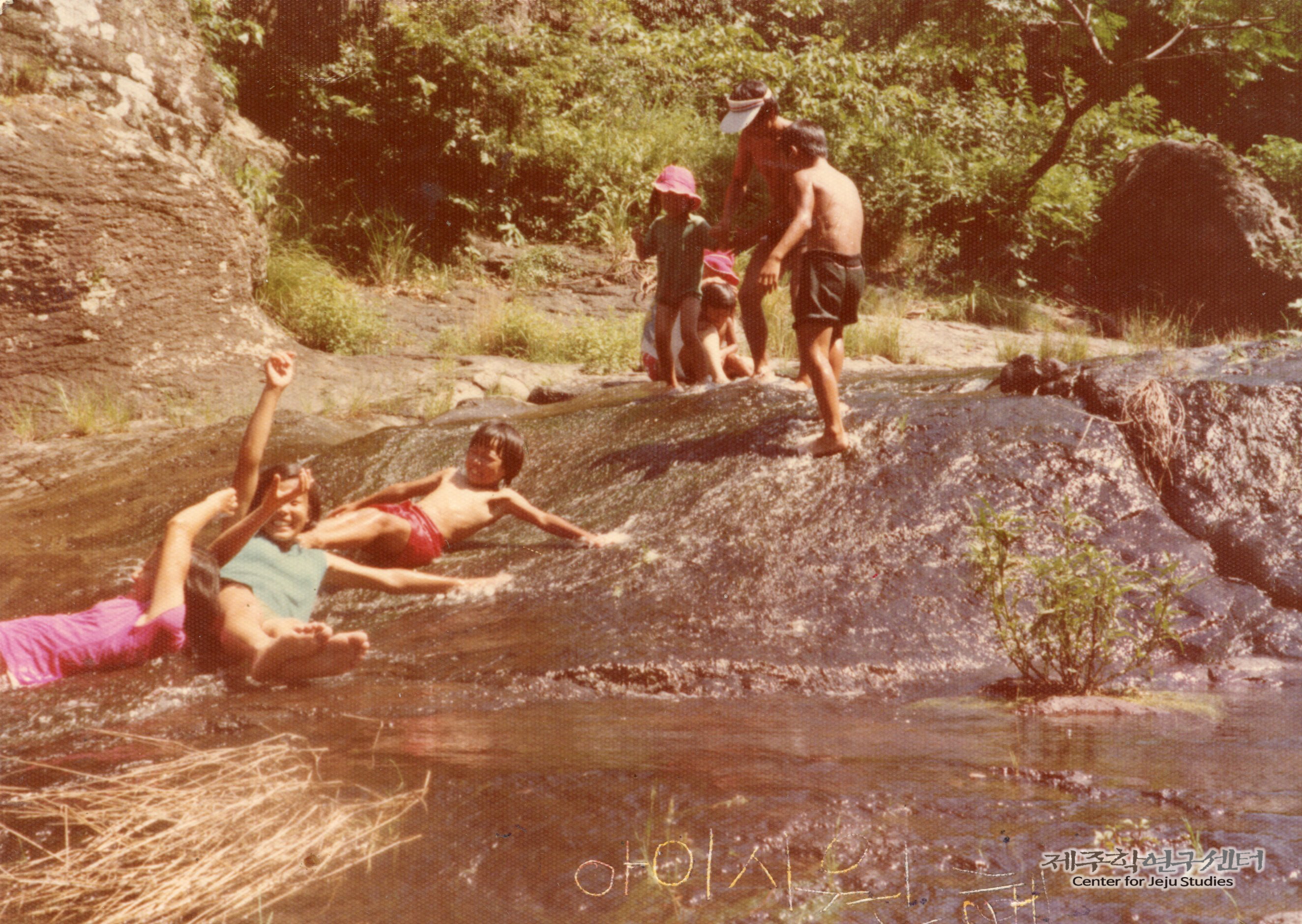 4) 사진 설명: 여름철 무더위를 식히기 위하여 계곡에서 물놀이를 즐기고 있다. 사진 속 아이들은 계곡물이 흐르는 바위 위를 미끄럼틀을 삼아 타고 내려오고 있다.