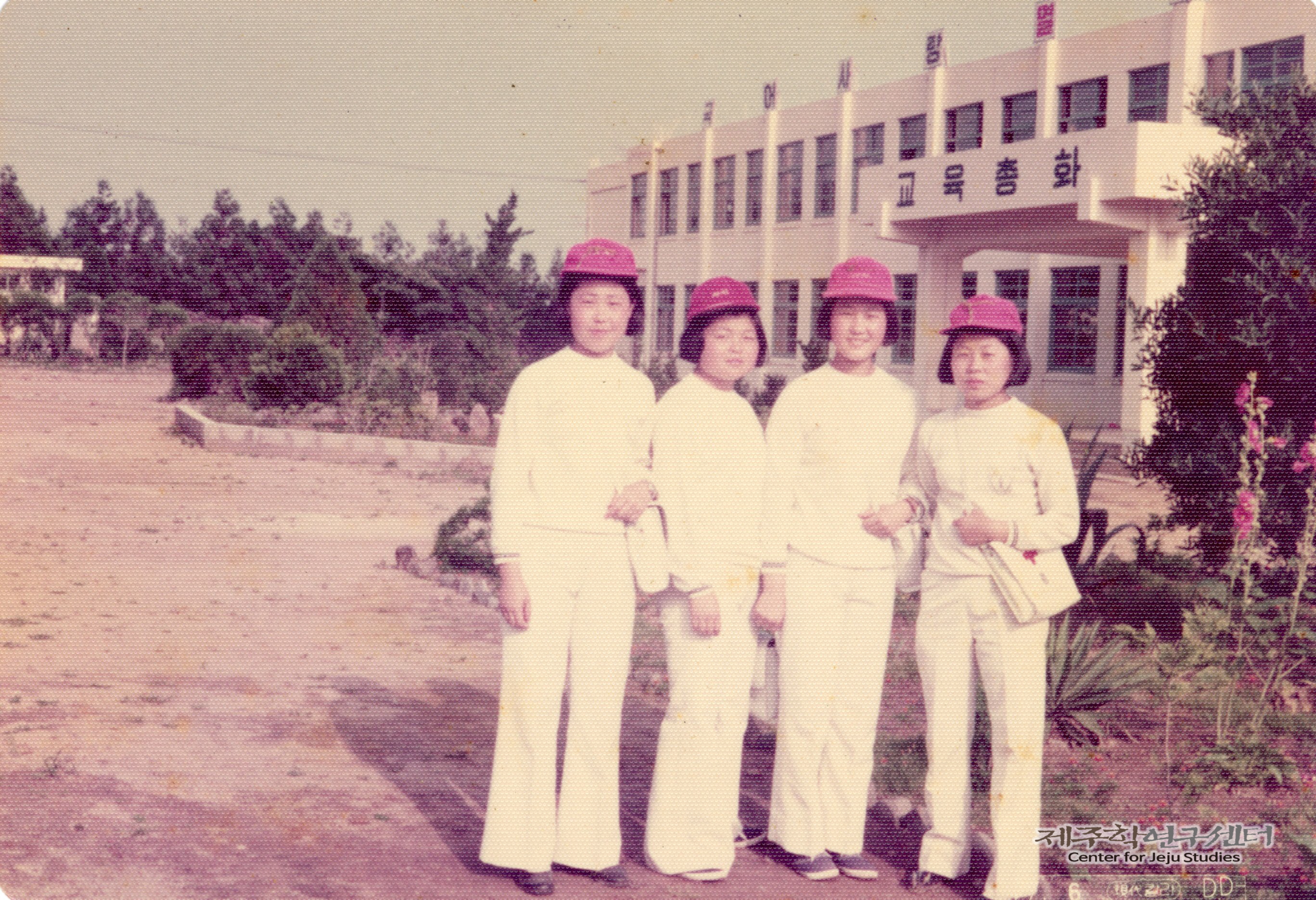 2) 사진 설명: 서귀포여자고등학교는 1975년 6월 현 부지(서귀포시 호근동 1561번지)로 신축 이설하였다. 이설한 학교 운동장에서 흰색 교련복을 착용한 여고생 4명이 기념 촬영을 하고 있다. 학생들 뒤로는 서귀포여자고등학교 옛 건물이 보이는데, 입구 앞에는 '교육총화'란 글이 새겨졌다.