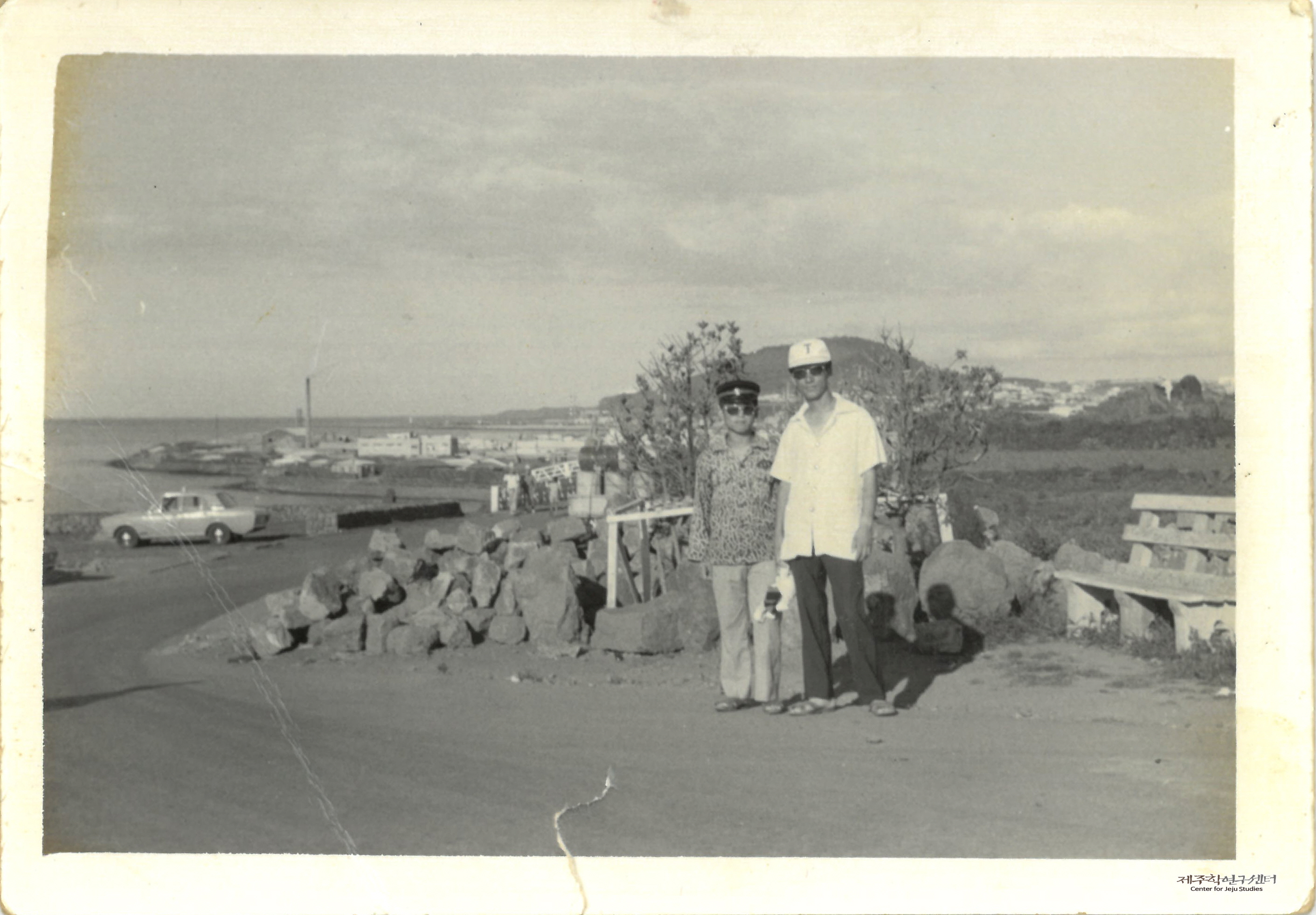 제주상업고등학교 뒤편 용담동 한 동산에서 촬영한 사진이다. 사라봉과 해안가 풍경을 배경으로 담임교사와 교련복을 입은 강홍종 씨가 함께 찍은 사진이라고 한다.