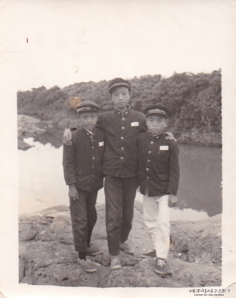 소장자 강남석 씨는 귀일중학교를 다니던 시절 친하게 지냈던 친구들과 함께 애월읍 광령리에 있는 무수천으로 놀러간 기념으로 촬영한 사진이다. 사진 속 학생들은 교복과 교모를 착용하고 운동화를 신고 있다. 가운데 서 있는 강남석 씨는 학급 내에서 가장 키가 컸다고 한다. 인물 뒤로 무수천과 기암괴석들이 있고 이곳은 당시 청년들이 나들이로 즐겨찾던 명소라고 한다.