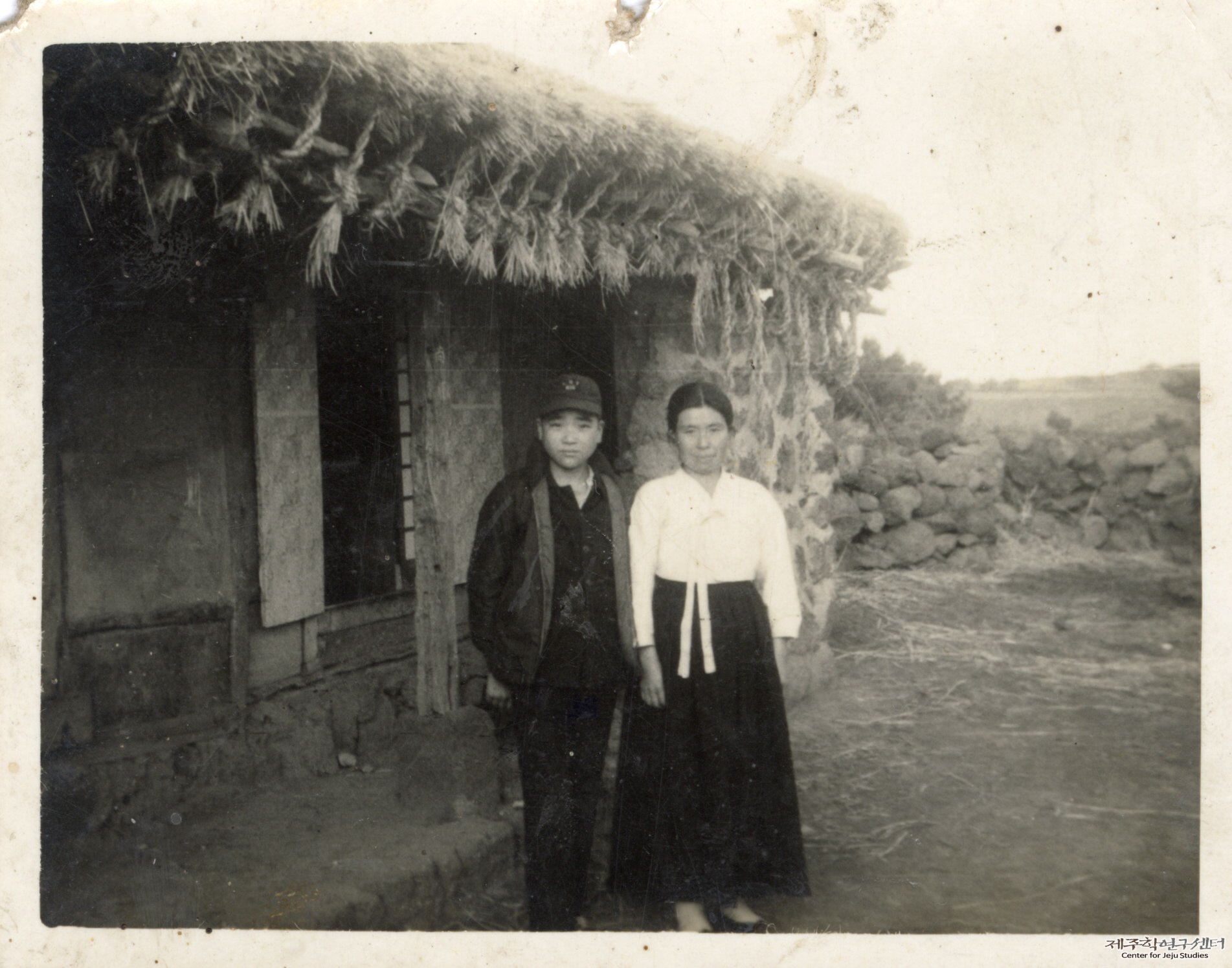 김원출 씨 어머니와 중학생이던 남동생이 초가 마당에서 촬영한 사진이다. 어머니는 정갈하게 쪽머리에 흰색 저고리와 검은색 치마를 착용하였고 남동생은 단정하게 일상복을 입었다. 그들 뒤로는 제주 전형적인 초가 모습이 보인다. 초가의 '집줄'은 '거왕대'에 단단하게 동여매여 있고 창호지를 바른 문이 달려 있다. 보통 벽은 돌로 쌓아 올린 후 흙을 발르지만 김원출 씨 집은 그 위에 시멘트를 한 번 더 덧발랐다고 한다.